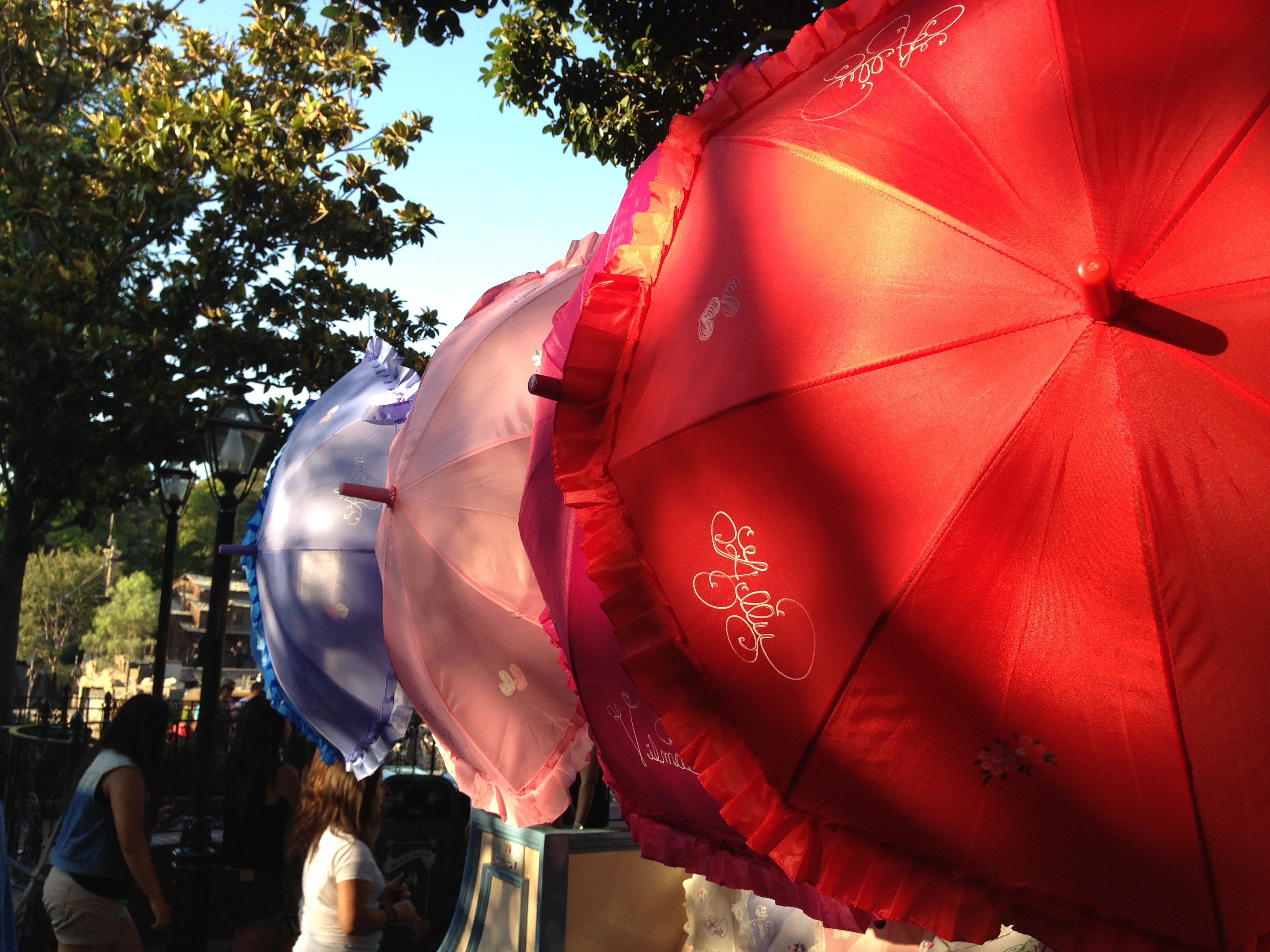 The best part was watching the children come up who got one. You do have to wait about 30 minutes to an hour to get your parasol because it does have to be crafted and the paint must dry a bit so take that time to go ride Haunted Mansion or Pirates of the Carribean. Go grab a bite to eat and come back. Your parasol will be waiting for you. They warn you also not to get it wet for at least 3 weeks and even then to really only use it in sunny weather for best use. When we were ordering ours, we saw another little girl come and get hers and she was so excited. And when we came back to pick up Emma’s she was simply delighted at this beautiful piece of functional art made just for her. There are lots of great souvenirs at Disneyland, but to come home with a piece of the magic made just for you is pretty special, too.