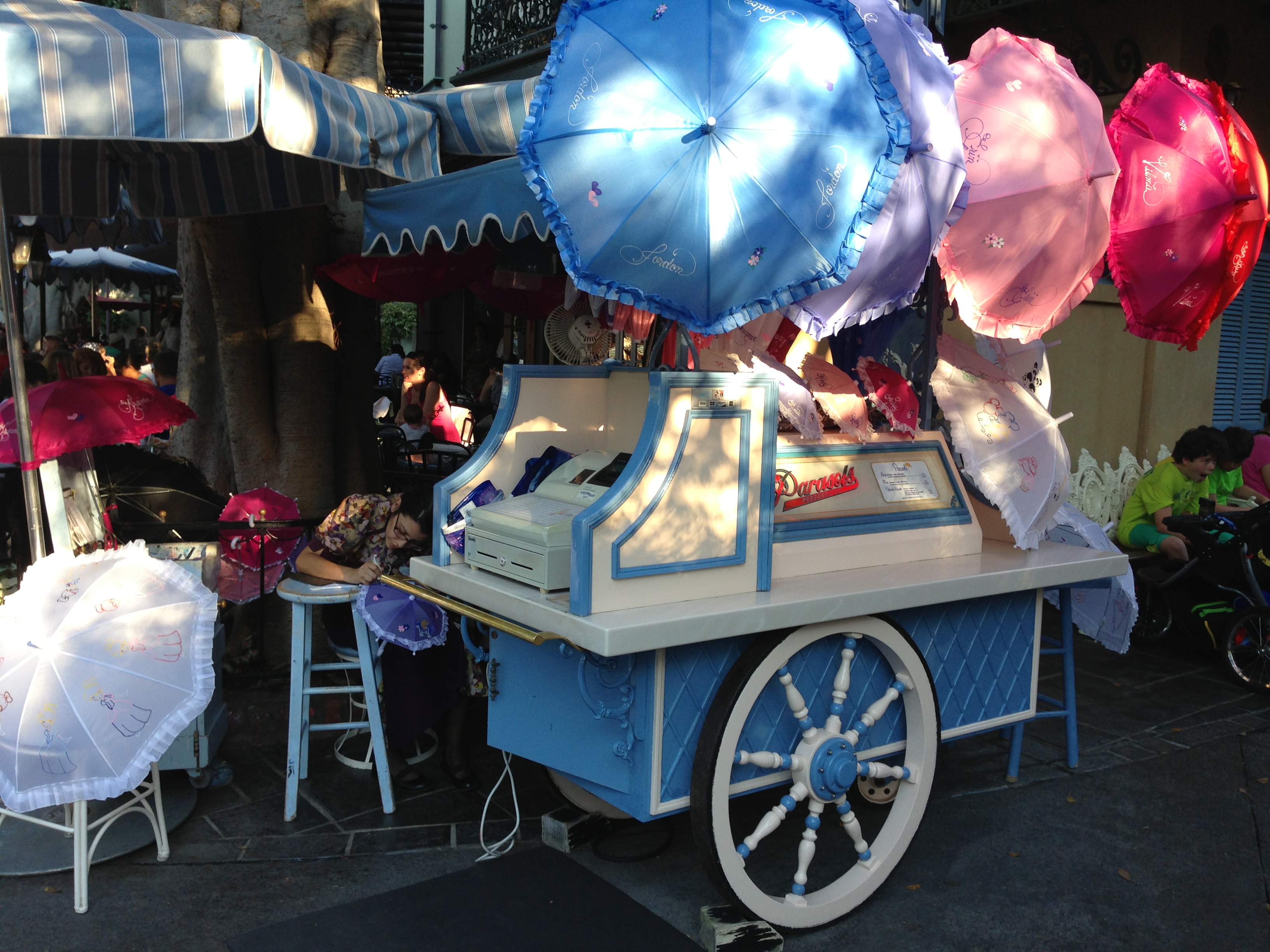 Odds are if you’ve been to Disneyland more than once, you’ve probably passed by this cart and may have even taken a brief glance at the beautiful parasols hanging from it. But it wasn’t until my daughter Emma and I were spending time together at the Park that I really noticed this true gem of personalized souvenirs.