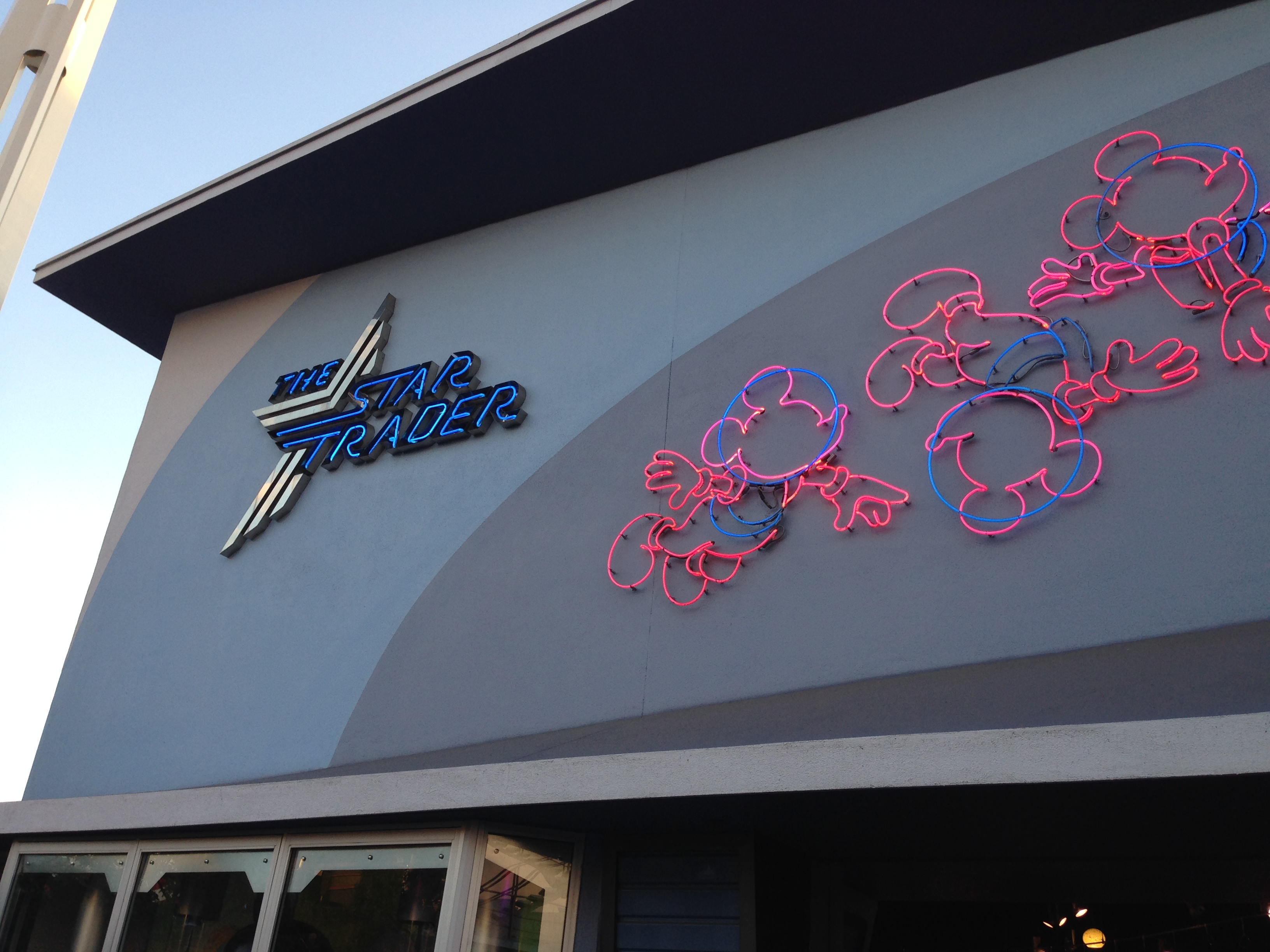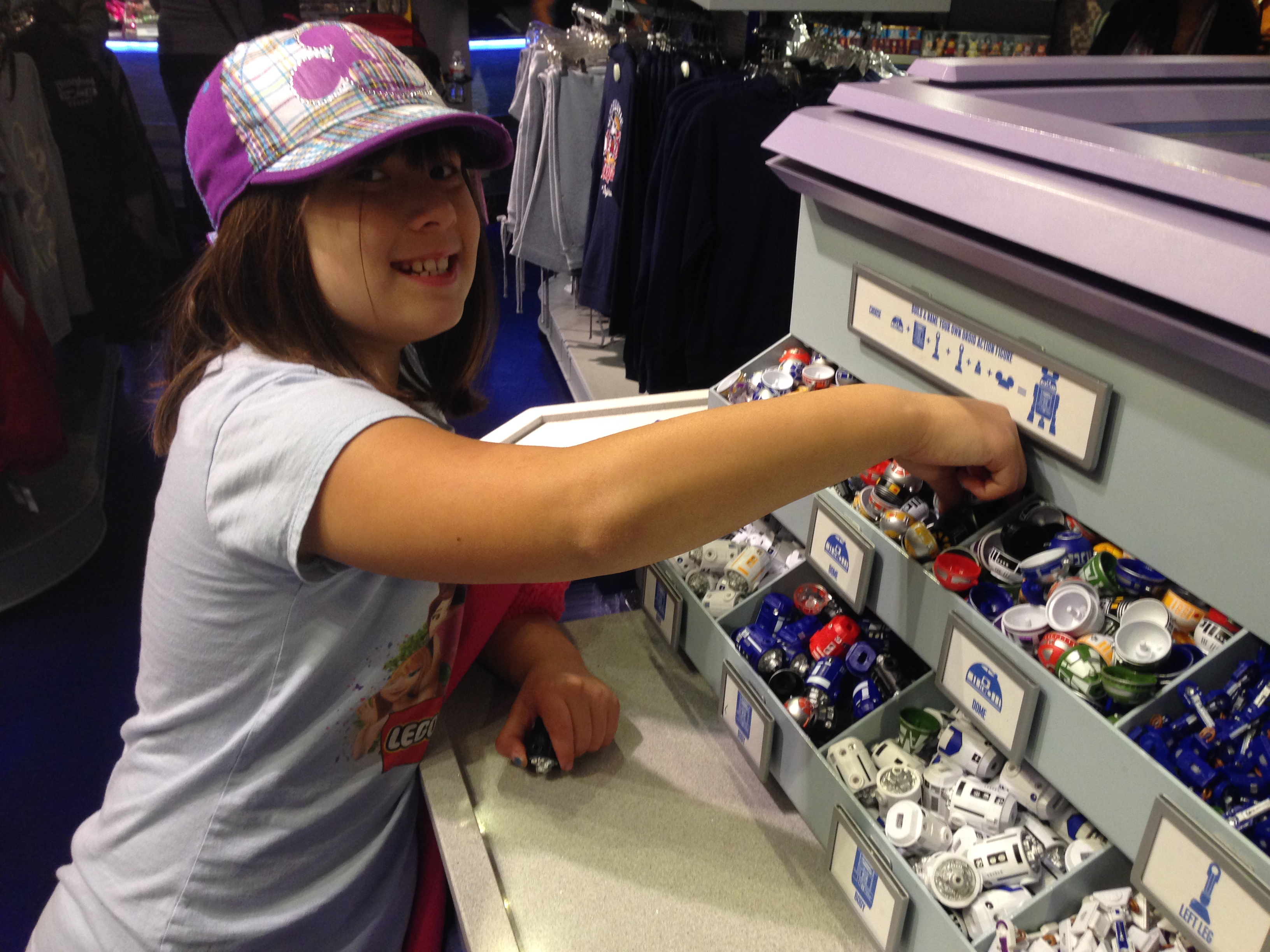 The Star Wars Droid Factory is located in the back of the main section of Star Traders and is incredibly fun. Kind of tucked away and not obvious as you walk in, this new merchandising feature let’s you build your own Kenner-like action figure! A Star Wars fan’s dream. Ever imagine your own droids growing up? Thinking you could have created a more stylish droid? Well, now you can show off your creative ability to the world (or at least your friends). Options are limited to non-bipedal droids so no C3PO styles available. But you can build an exact replica of R2D2, R5D4, or any other similar style. They have different colors, different styles, different heads and legs so you can mix and match in whatever way you like. They even have little head bling for your droid – mouse ear hats, Goofy hats, etc., often with Rebel logos on them. Go crazy and wild!