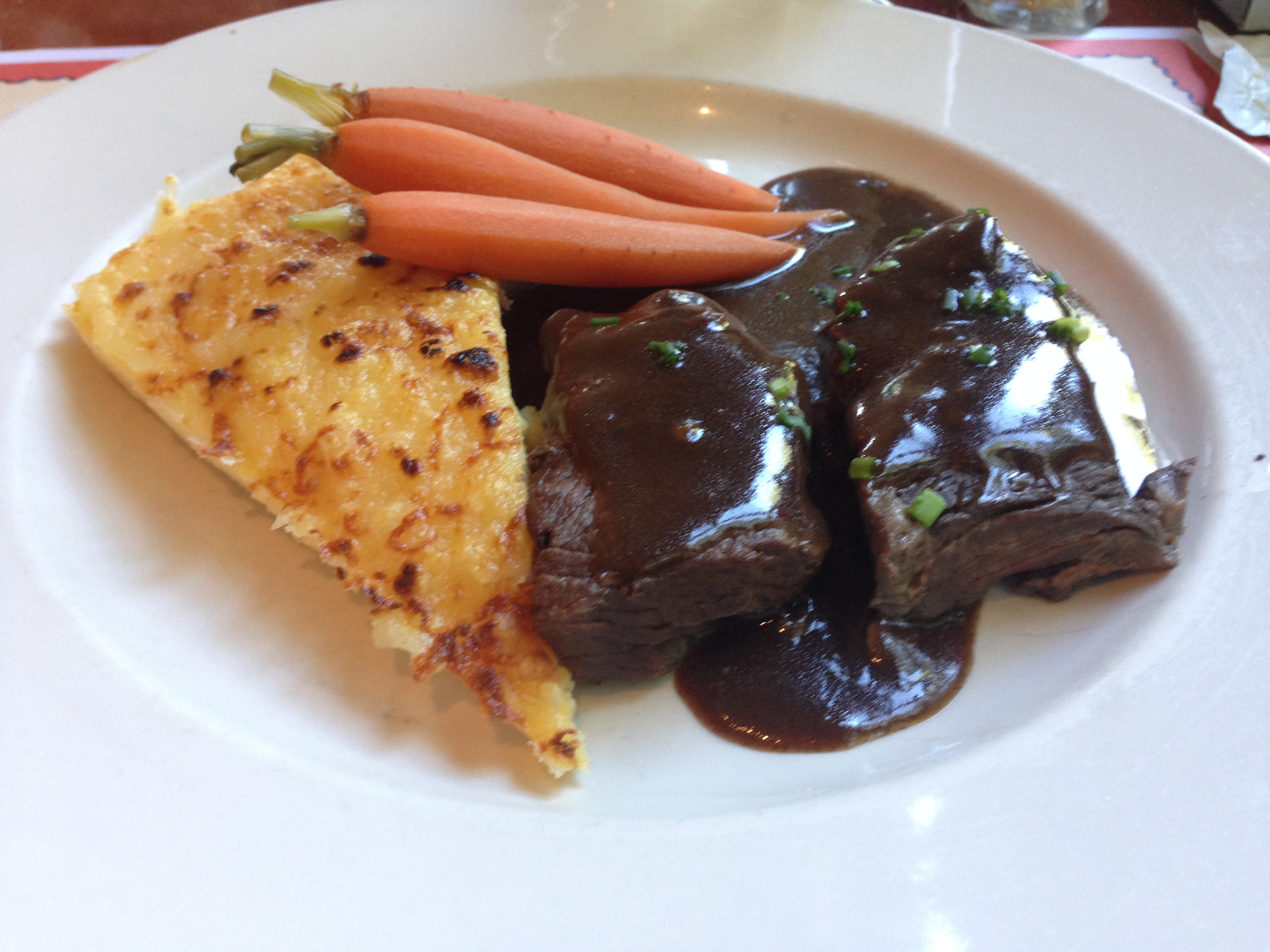 To open, I chose the lobster bisque. The soup was creamy, tasty, and smooth. It was exactly what I expected from a good lobster bisque. I would love if they had more lobster in it, but that’s because I like lobster. It came with a baguette of French bread (which they probably just call bread). The bread was tough on the outside and soft on the inside. It was hot and fresh when they brought it to the table. After polishing off the soup it was time for the main course. I chose the beef short ribs that were braised in Cabernet and served with a slice of polenta (and carrots and yes even they tasted good). The Cabernet sauce was rich and brought out the natural flavor of the short ribs. The ribs were tender and could be eaten without a knife. The polenta was the only thing that didn’t blow me out of my socks but it still tasted good. To end the meal was the chocolate mousse. Now I’ve had really good chocolate mousse before, but this was so rich and flavorful with the slivers of white chocolate on top. Wow. What a perfect way to end the meal.