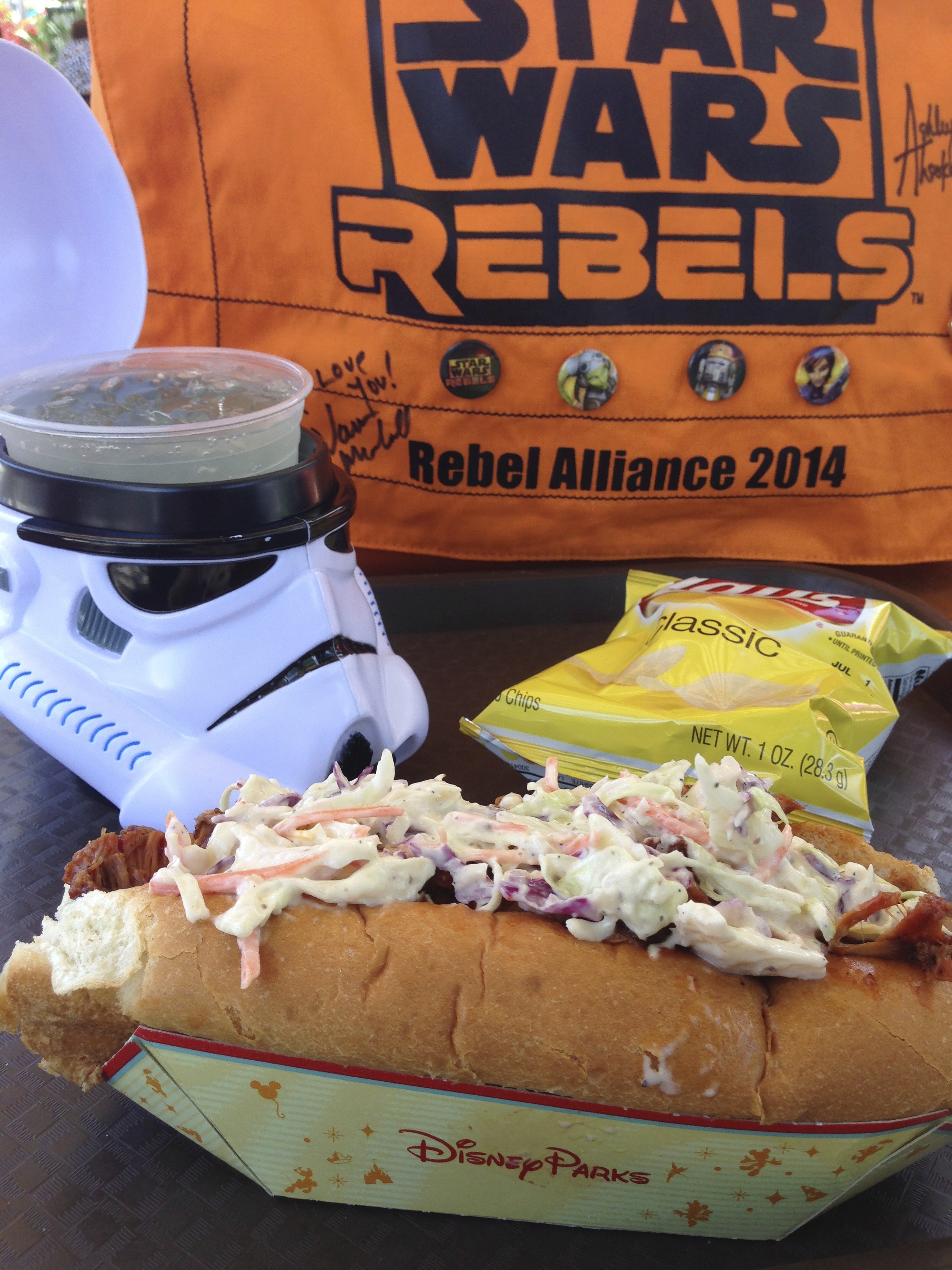 This was a great place to go for a quick meal. While it does get crowded, there was ample seating and the food was served fast and fresh. Personally I went for the Fairfax Fare slaw dog with chips and a Stormtrooper mug of lemonade (it WAS Star Wars Weekends). It was better than I thought it would be and I was really in the mood for a good dog. Having a slaw dog if you’ve never had one is a Southern treat and combines the crunchy texture of the slaw with its sweetness combined with the powerful savory flavor of the dog. The BBQ pork was just and added bonus. I finished the meal with the apple crisp from Hollywood Scoops and I was pretty skeptical about it, but it was definitely worthwhile! The apples were soft but firm enough, the ice cream was of good creamy quality, and the crumble which is the highlight of any crisp was sweet and tasty. All-in-all quite delicious.