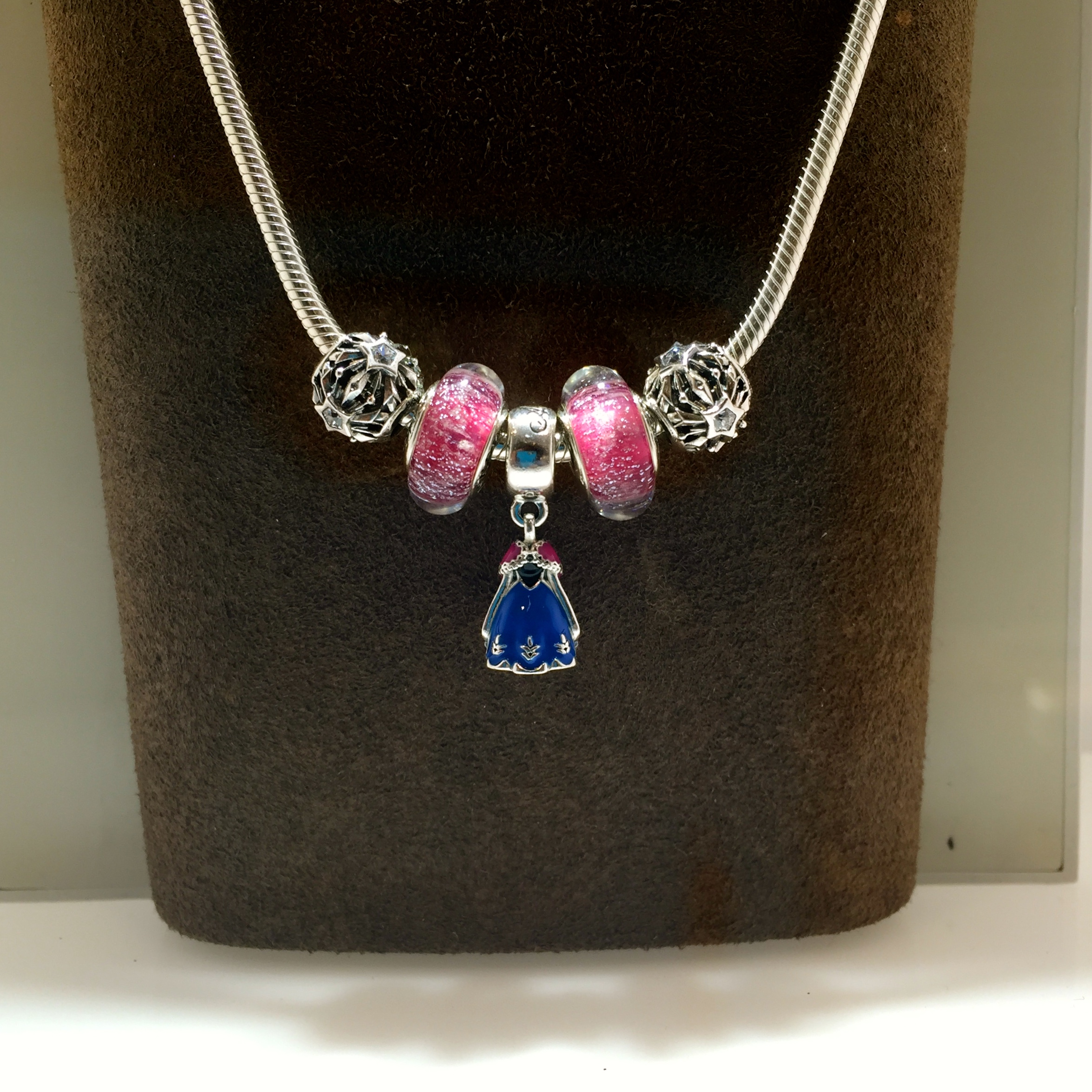 These charms are not cheap, but they are also not priced so high that they are out of reach. But be aware that pricing is a la carte – meaning that each and every piece you see on a bracelet or necklace has to be purchased individually – including the bracelet or necklace. If you buy a bracelet from Pandora they come in different styles and compositions from fabric at $35 to 14K gold at $1415. There are leather bracelets which are sturdy and still reasonably priced at $45-50 but the most common one I noticed was the $65 sterling silver bracelet. The bracelet is important because it is the foundation of your charm collection. Necklaces can also be bought directly from Pandora either at one of their stores or online for a wide range of prices.