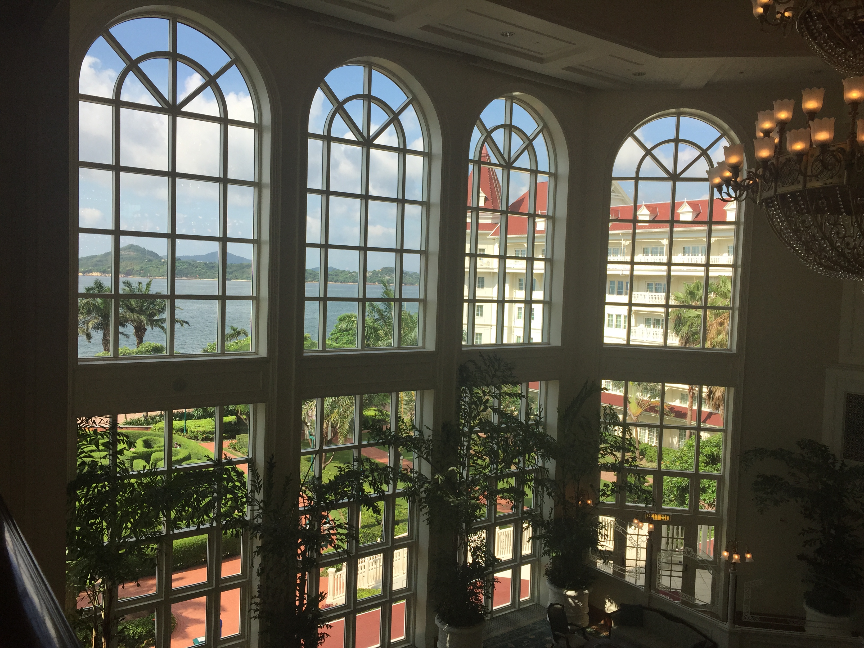 The rich Victorian style was reminiscent of the Grand Floridian or Tokyo Disneyland Hotel. The decor was subtly Disney. The bedspread had pictures of Pinocchio on it, but it took me until the second day of staying there to even notice (and that’s because my daughter pointed it out). Every amenity you could think of was provided for you on a tray in the restroom – from an emery board to a shower cap to toothbrush and toothpaste – without having to ask. Cute postcards and stationary were provided every day in the hotel room folder. And the view was spectacular. It felt like being in Hawaii. We were surrounded by lush green mountains, beautiful trees, and amazing landscaping. At night a live band would play in the lobby balcony. They would play riffs on Disney classics and sounded beautiful as you can tell in the clip below.
