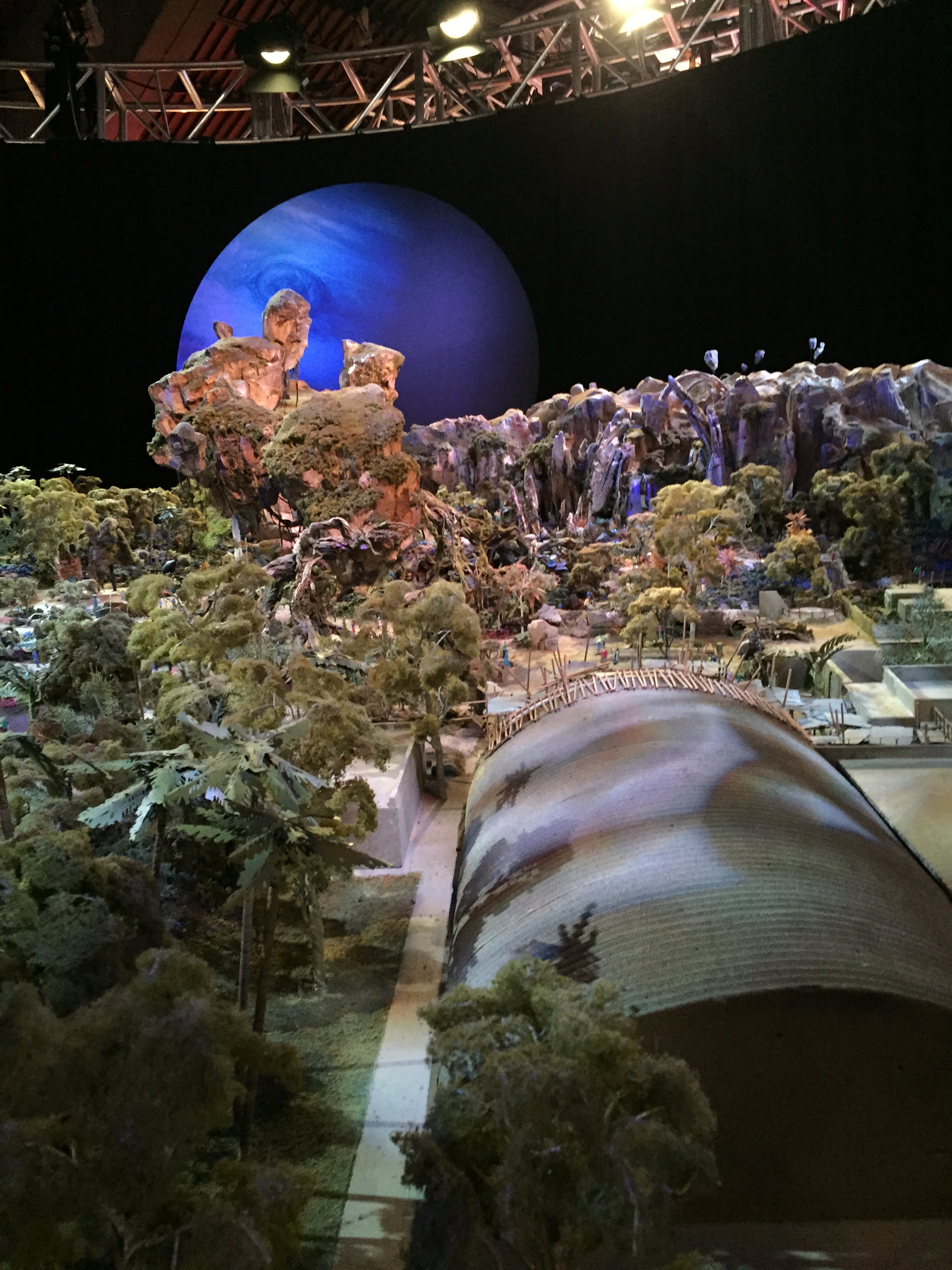 Disney and James Cameron joined together to develop an entire land in Animal Kingdom based on the box-office hit, Avatar. Never in Disney’s history has an entire new land in one of its theme parks been dedicated to a non-Disney property until now. While it remains to be seen if Avatar will have the lasting staying power of other Disney collaborations (Star Wars and Indiana Jones franchises to name two), plans for the new land are past the development stage and deep into implementation with a projected opening date in 2017. While Disney is famous for keeping things under wraps to enhance the wonder for guests, it’s hard to hide the floating mountains of Avatar that are already starting to appear in the Animal Kingdom skyline. At the D23 Expo 2015, some details and a a large scale model of the new area were revealed that gave attendees an idea of what the finished land will be like.