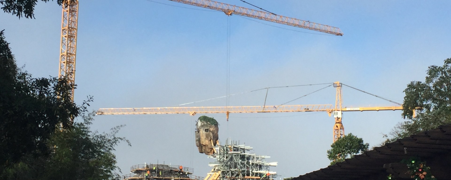 Pandora is beginning to take shape. Because the structures are so high, some of the construction cannot be hidden and it gives us a rare glance into seeing the magic taking shape. How the islands will appear to be floating is one of the many mysteries surrounding the evolution of Pandora. What will be more interesting will be to see how Disney masks the beams needed to hold the islands in the air and to watch it move toward completion. Pandora is part of Disney’s initiative to turn Animal Kingdom which traditionally has been pretty much a daytime park into a full day experience. With apparently bioluminscent flooring in the Pandora area, the land will come to life in new ways after dark. This will be coupled with the new Rivers of Light show being produced for the park and set to open this year. Now I wonder if that big blue moon is just a prop or will actually be part of the experience in Pandora? I guess only time will tell.