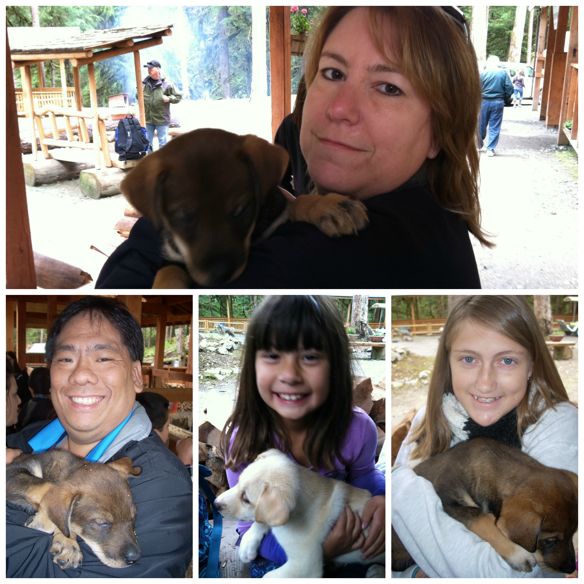 Our second cruise was a 7-day voyage to Alaska via a port in Vancouver, Canada. That was probably our favorite trip. It meant less time outside on the deck and very little swimming even in the summer, but we had so much fun. It was on this trip that we were able to pan for gold with Donald Duck and Chip and Dale! After panning for gold, we had an all-you-can-eat salmon feast complete with rice, beans, salad, and cornbread. And at the end we had s’mores over a campfire using real tree branches (clean ones by the way). It was also on this trip that we had the chance to go dog sledding by a professional team of dogs. The best part was not the sledding as fun as that was. The best part was getting to pet all the puppies that were dogs-in-training. Just too much fun. We wanted to take them all home with us. In Ketchikan, we stayed mostly in port, saw the totem poles, ate some great salmon and fudge, and went to a lumberjack show where my daughter Emma helped win for her team! That was a lot of fun, too.
