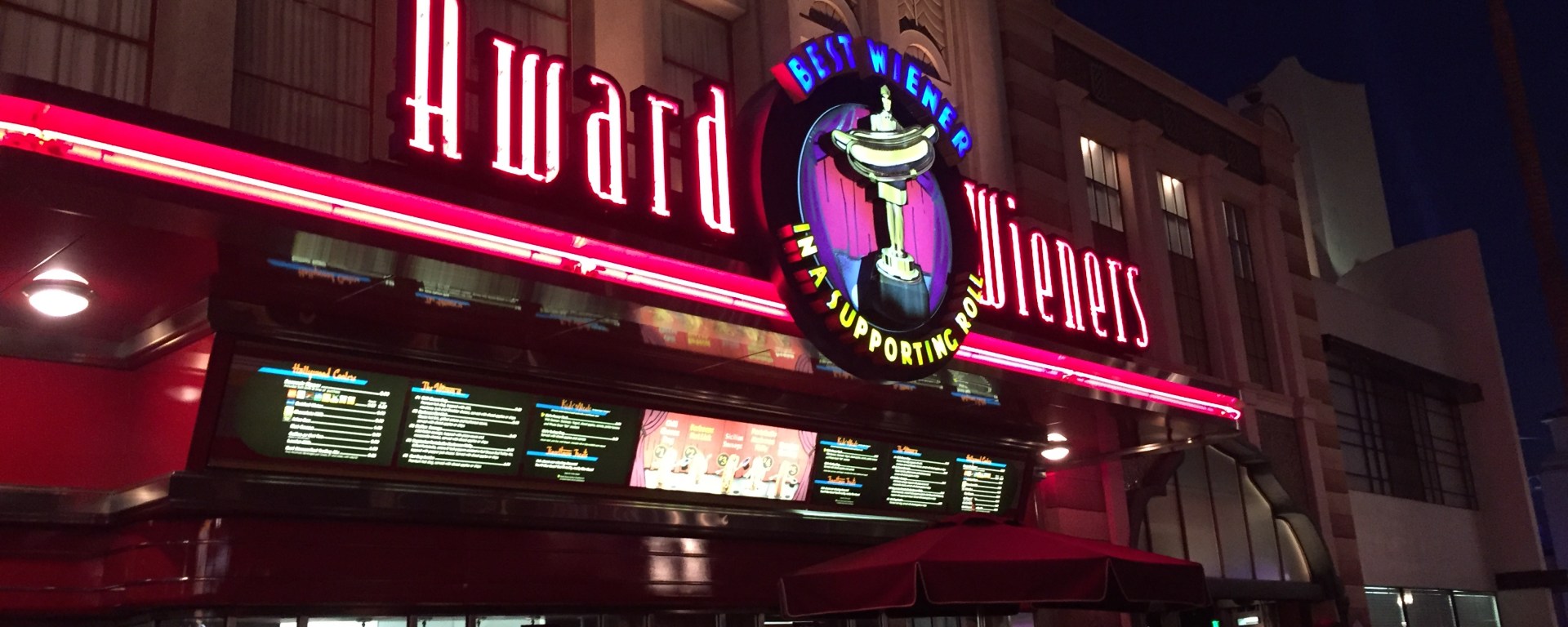 Looking for a quick bite in Disney California Adventure? If you like hot dogs, you can’t go wrong at Award Weiners. As it says on the sign it really is the “Best Weiner in a Supporting Roll.” This little quick service spot just down the main thoroughfare of Hollywood Land. Rarely a long line, it’s a great place to stop when you want a quiet little respite from the hustle and bustle of the park. There are seats right around the corner from the trolley in the wall where you order your meal and it’s tucked just far enough out of the way as to usually not draw tons of people. Best feature of all? The dogs are GOOD!