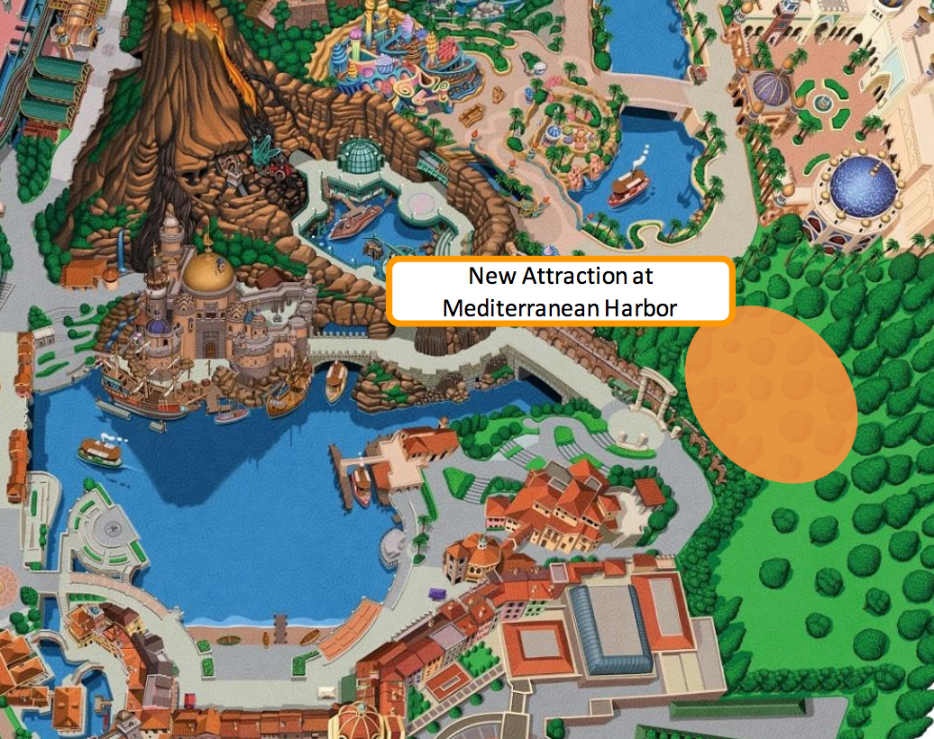 In Tokyo DisneySea, a Japanese version of the popular Soarin’ attraction will be installed in the Mediterranean Harbor area of the park. It will be placed in what is now largely an empty area that connects the harbor to the very popular Mysterious Island. From the press release description, it looks to be a clone of every other Soarin’ attraction featuring the updated Soarin’ Around the World film.