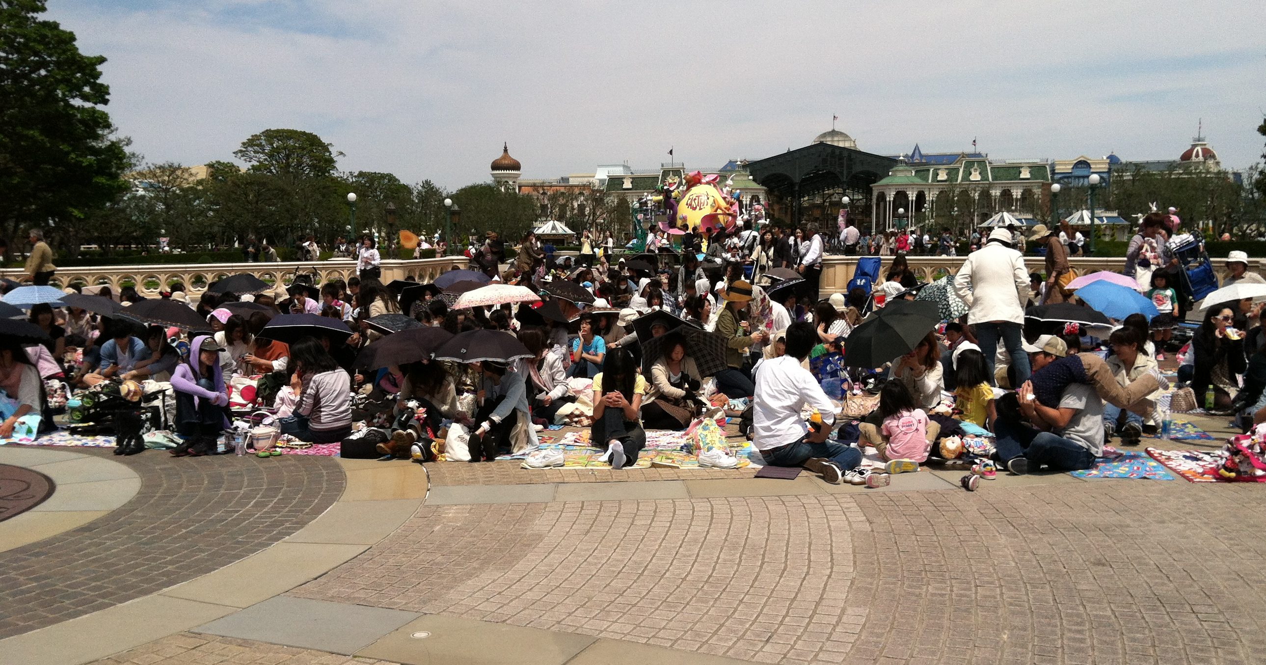 Updated 2016: I could see the 2012 Easter Wonderland Parade clearly from across the hub, and at Tokyo Disneyland the hub is REALLY big. Tokyo Disneyland was seemingly built specifically for parades. The routes seem twice as large as any other park and that’s a good thing because the Japanese crowds seem to especially love them. As soon as the park opened (I kid you not) people began waiting in prime locations. They spread out blankets, opened up umbrellas to protect themselves from the sun, and just waited super politely. By the time the parade was about to head down the pathways, there was a sea of umbrellas and blankets all up and down the route.