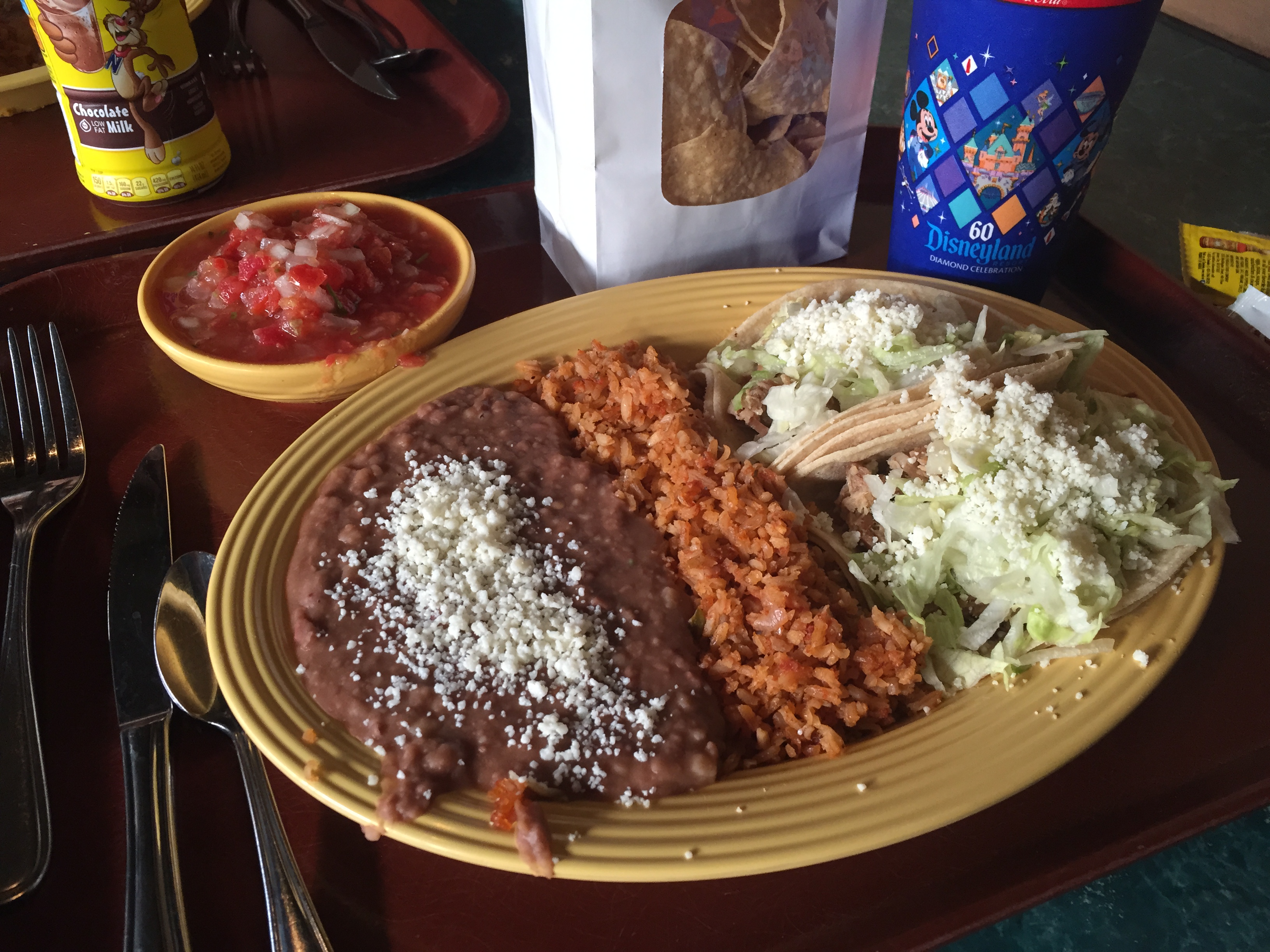 I’ve come back to this place over and over so its surprising that I haven’t written a review yet because this place is good. The atmosphere is relaxing, the food is tasty and fresh, and the selection is plentiful. Like most restaurants in Disneyland, they limit their menu to do more things well, but there is still a lot to choose from. Tostada salad, Hacienda Caesar salad, street tacos, baked fish tacos, burritos, enchiladas, carne asada, citrus-fired grilled chicken, and chile verde are the options they have to offer. You can have the tacos and burritos with your choice of chicken, beef, or carnitas (pulled pork). The enchiladas come in cheese only, but they are really good.