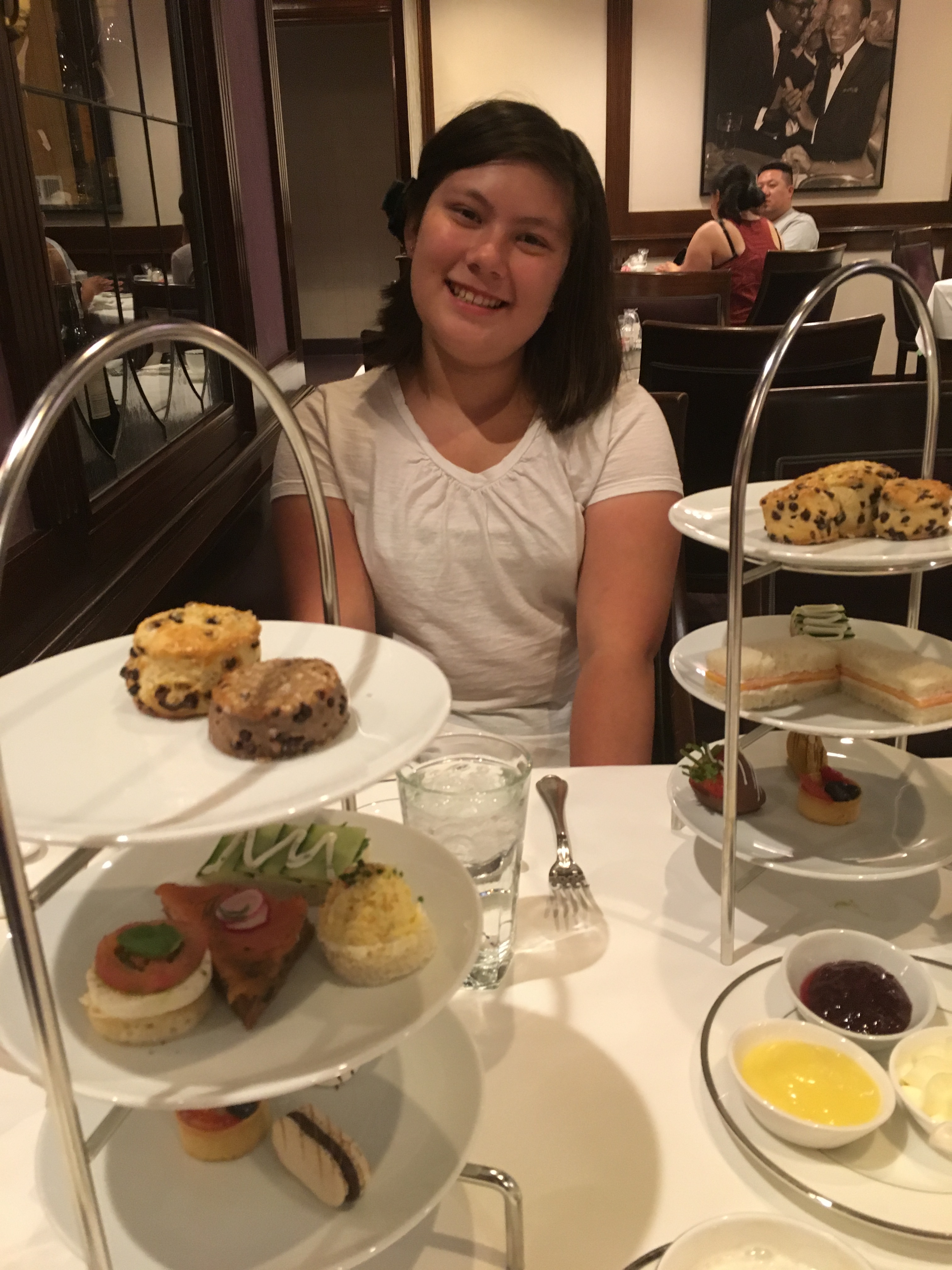 Because they pull from an assortment of macarons, you might get different ones each time. The same is true about the chocolate covered strawberries. We ended up with two milk chocolate and one white chocolate covered strawberry. Although we were happy with our selections, I’m sure you could request different kinds if you were so inclined. My daughter isn’t a PB&J fan so they gave her an extra ham and cheese and when she didn’t like the cucumber sandwich our server offered to give her another one. The service is more than excellent. We had such a good time.
