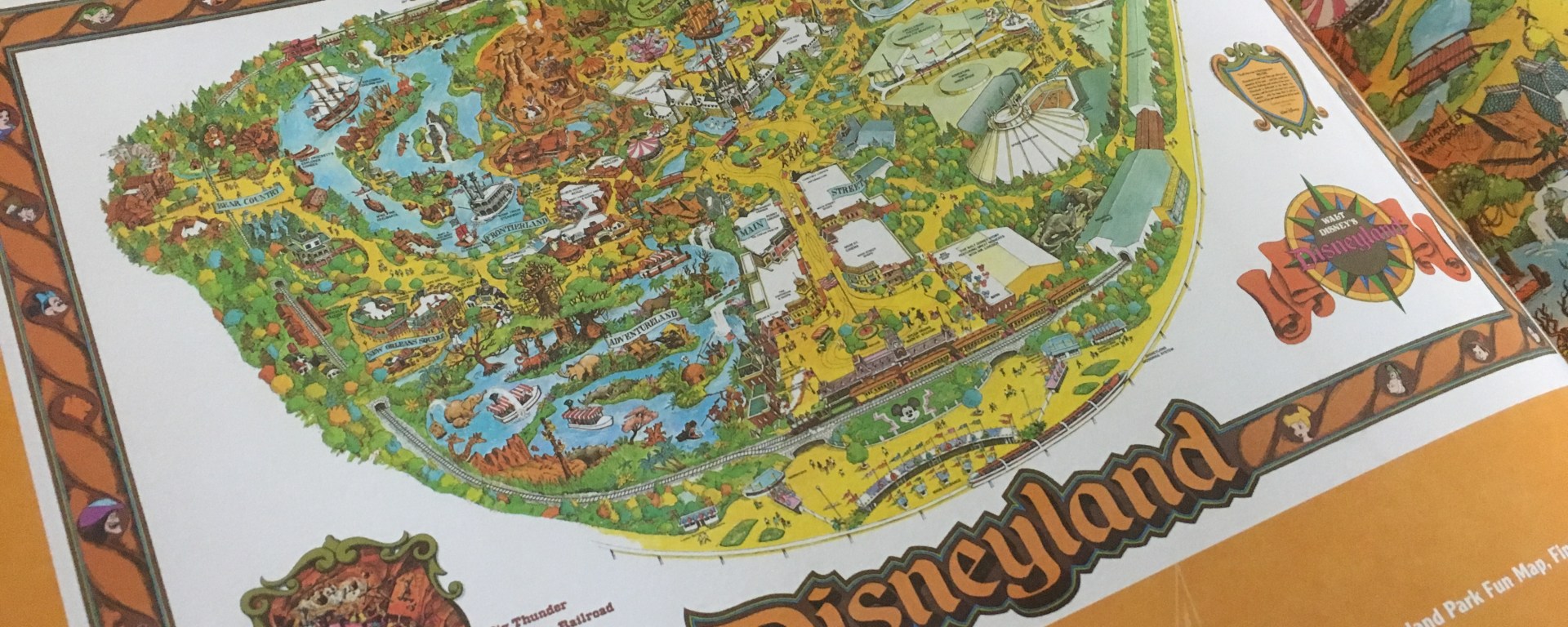 What this book does not include is a collection of theme park guidemaps throughout the years. Interestingly, even though there are many representations of brochure maps, maps on walls throughout the parks (like Sindbad’s Storybook Adventures and Pooh’s Hunny Hunt in Tokyo Disneyland), and maps for attractions like Tom Sawyer’s Island, the guidemaps are strangely missing. Instead the curator Vanessa Hunt focused on the big “fun maps” you can buy which show extraordinary detail of the attractions and their location. In addition to showing an overview of the map, most also have a page dedicated to a 100% full size section of it so you can see the detail for yourself.