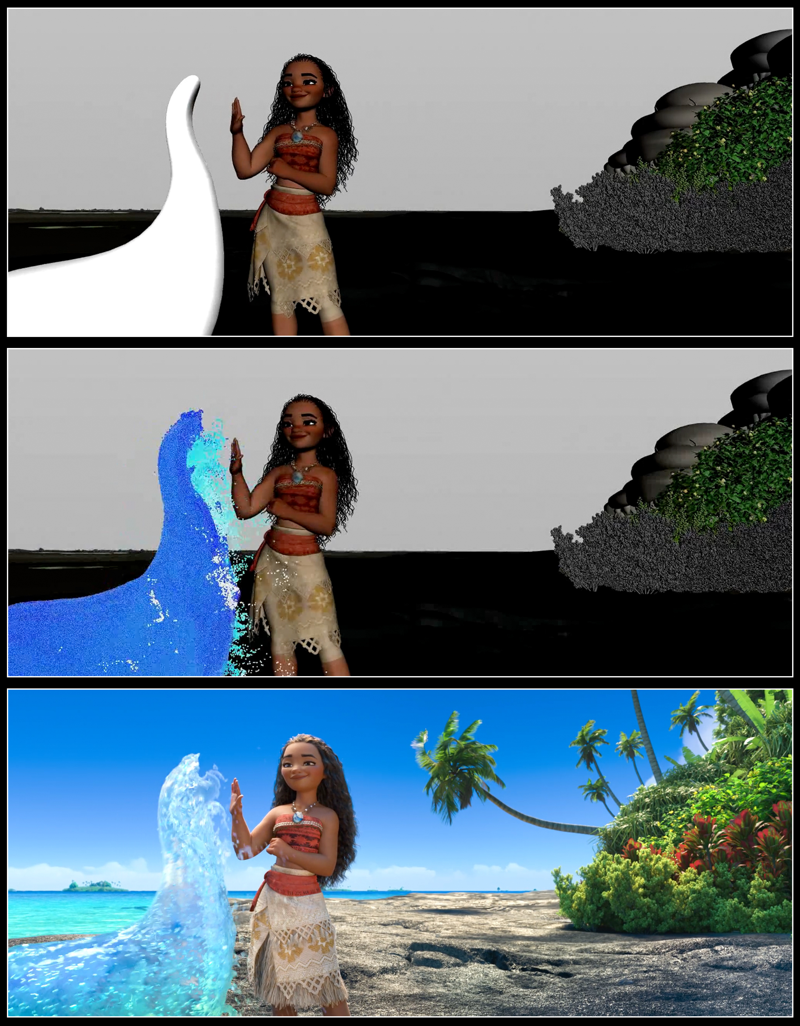 Well she did until a direction change in her character eliminated them. Missing from the movie was a sailing race Moana had against them all which she wins and proves her sailing prowess, but her father, unwilling to risk his daughter on the open sea, denies her the rightful place she earns. Her brother, Wakaroa, sticks up for her but is still denied. There were other scenes that didn’t quite make it into the movie for one reason or another and directors Ron Clements and John Musker explain why. But what is fascinating is that these aren’t just tiny clips but much more developed scenes in terms of story and voice primarily using storyboard illustrations as animation.