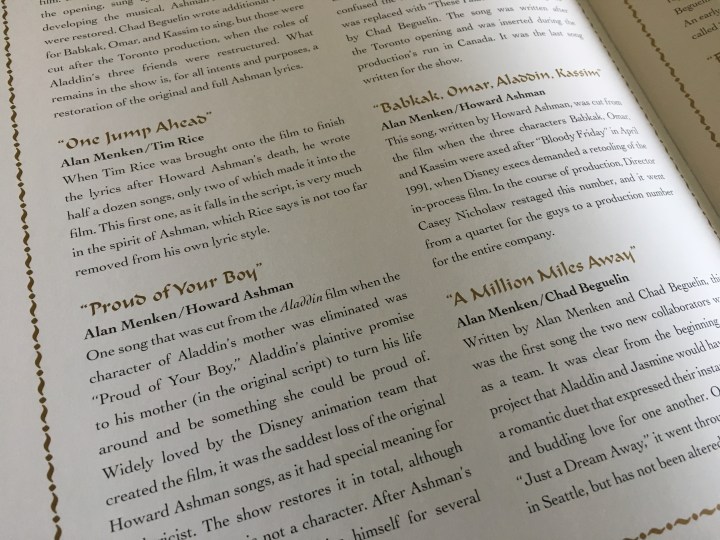 Some of the stories were done interview style while others were seemingly written by the person it was about. Lots of interesting information about the process of putting together something as complex as a Broadway stage production as well as specific information about what goes into Aladdin day in and day out. Did you know that each of Jasmine’s wigs cost $3,500 a piece? Or that there are over 1,000 different fabrics used on the costumes? Or that they have an illusion design specialist to work specifically on things like the flying carpet (Jim Steinmeyer)?