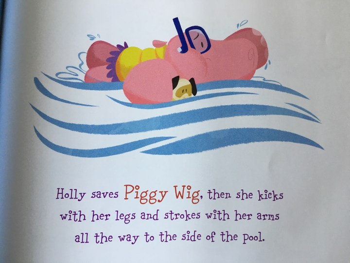Holly’s Day at the Pool joins a select group of books which have been illustrated by such talented artists as Lorelay Bove and Andy Harkness. Benson Shum (who has worked on such films as Frozen, Big Hero 6, Zootopia, and Moana) brings the colorful pink hippo Holly to life. And while the story is definitely cute, the art really shines. I can’t help but be drawn to the beautiful choices Benson makes in choosing how to draw and color the book. Holly is the perfect salmon color for a hippo (who are not known to be salmon-colored). The backgrounds contrast smoothly and brightly with the foreground. The lettering is the right compliment to the art and adds to the overall story. Just a complete book from beginning to end.