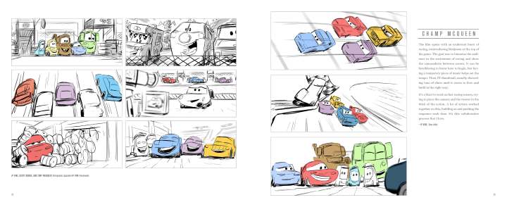 I particularly loved the pull-out section of the book where the top shows the cars from Lightning McQueen’s heyday and when you open it up you see the modern, slick cars which threaten to overtake McQueen’s now “classic” design. It’s just fun and impressive. My favorite part of the book however, are the “Deleted Scenes” featured in the third act. The Art of Cars 3 is divided into acts just like the film and while they roughly coincide to the action in the movie, they also explore different parts of the film. The first act heavily features the design of Jackson Storm and the set-up of the plot for the film. The second act delves more deeply into Cruz and the other characters who make up Lightning’s comeback from the crash (no big secret as it is revealed in the trailer). And the third act…well, I won’t give away anything about the plot, but in the book it features these deleted scenes of directions the story could have taken – complete with full storyboards and art. Hopefully, we’ll see some of these in the home release of the film with animation and voice over.