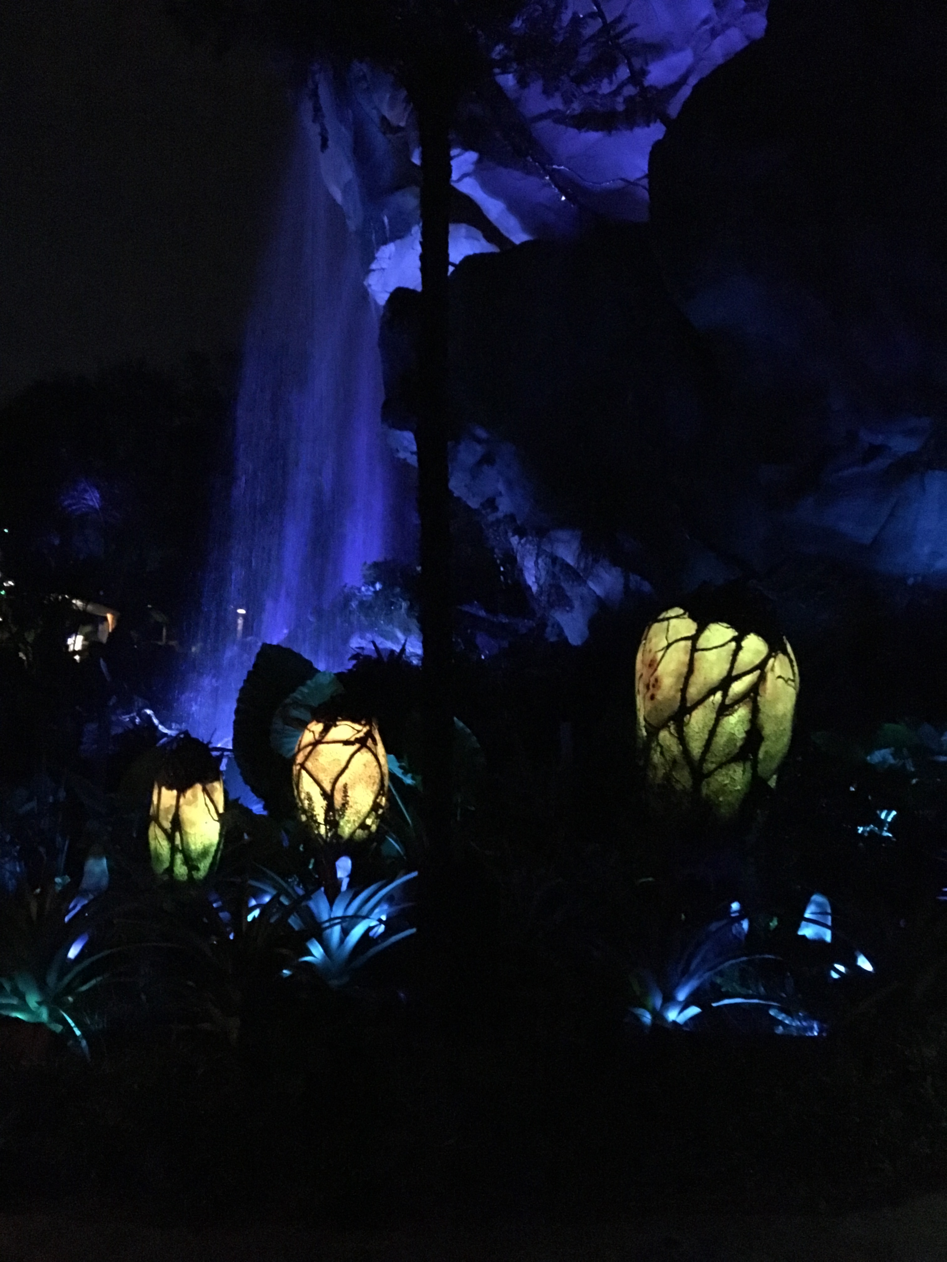 Architecturally, it was massively impressive. The floating mountains are gorgeous to look at. And even though it’s obvious they are not really floating, it still is awe-inspiring. The landscaping was also beautiful. Rich flora covers the land, the waterfalls are beautiful, and sounds of animals can be heard hiding in the bushes (although never seen). It was so realistic, I half expected drones that look like Pandora banshees (ikron) to come flying around the floating mountains. Now THAT would have been jaw-dropping. Maybe next time.