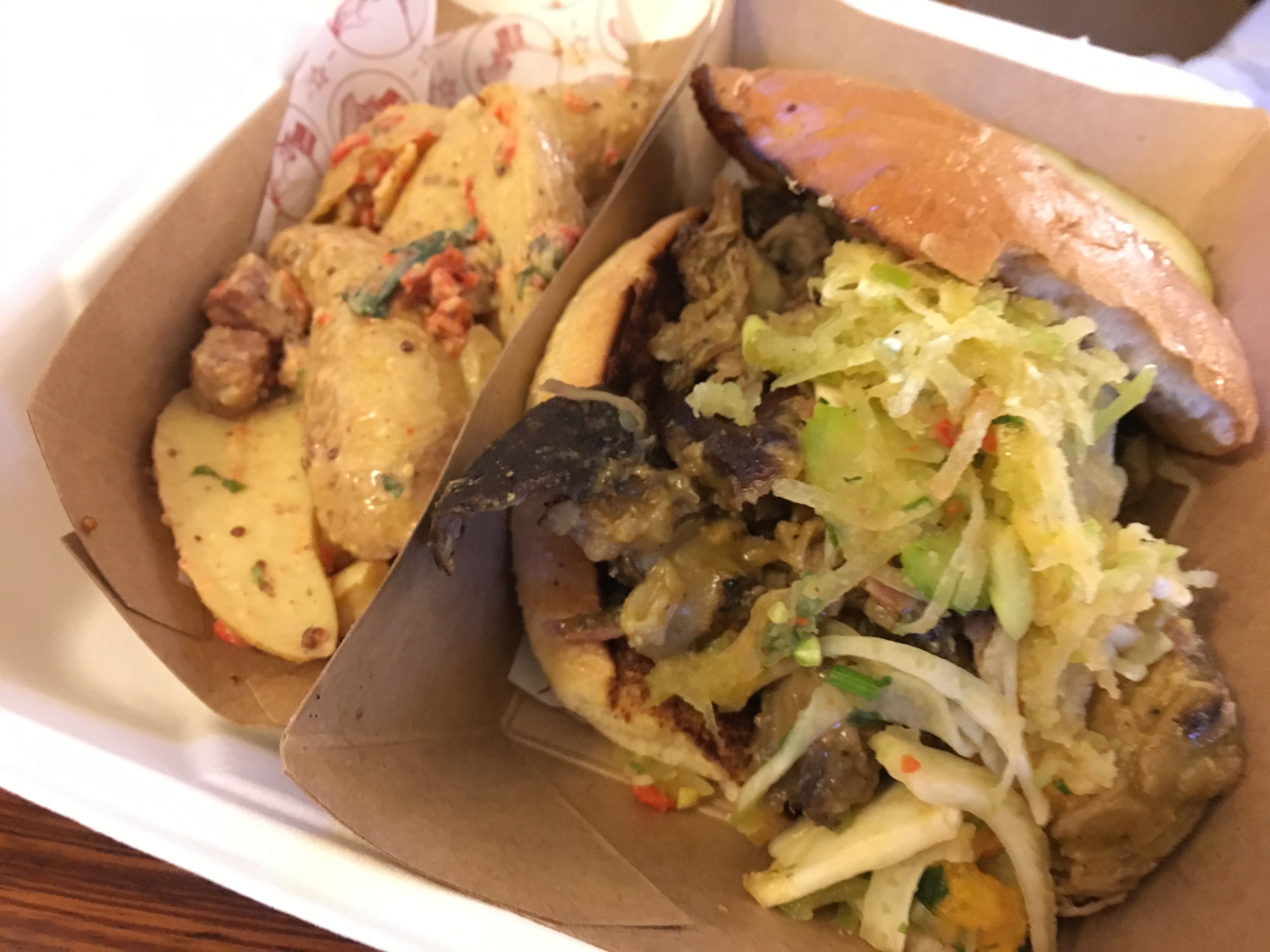 I finally narrowed it down to two choices – The Southern Pig and the Brisket Melt. I was having some gluten today and thought I’d give these sandwiches a go, although there were plenty of choices that looked gluten-free (best to check with the staff, but everything from the smoker looked great as did all the salads and most of the sides). Although I love brisket, I took a chance on the chopped pork of The Southern Pig. So glad I did. I’m sure I wouldn’t have been disappointed with the brisket, but I loved the pulled pork. The Southern Pig comes on a tasty bun that sops up the delicious juice of the meat and the Duke’s mayo and mustard sauce complemented it well. I wasn’t hot on the apple slaw by itself, but the sandwich really worked. I actually took it apart because I wanted to dip that pork in the sauce!