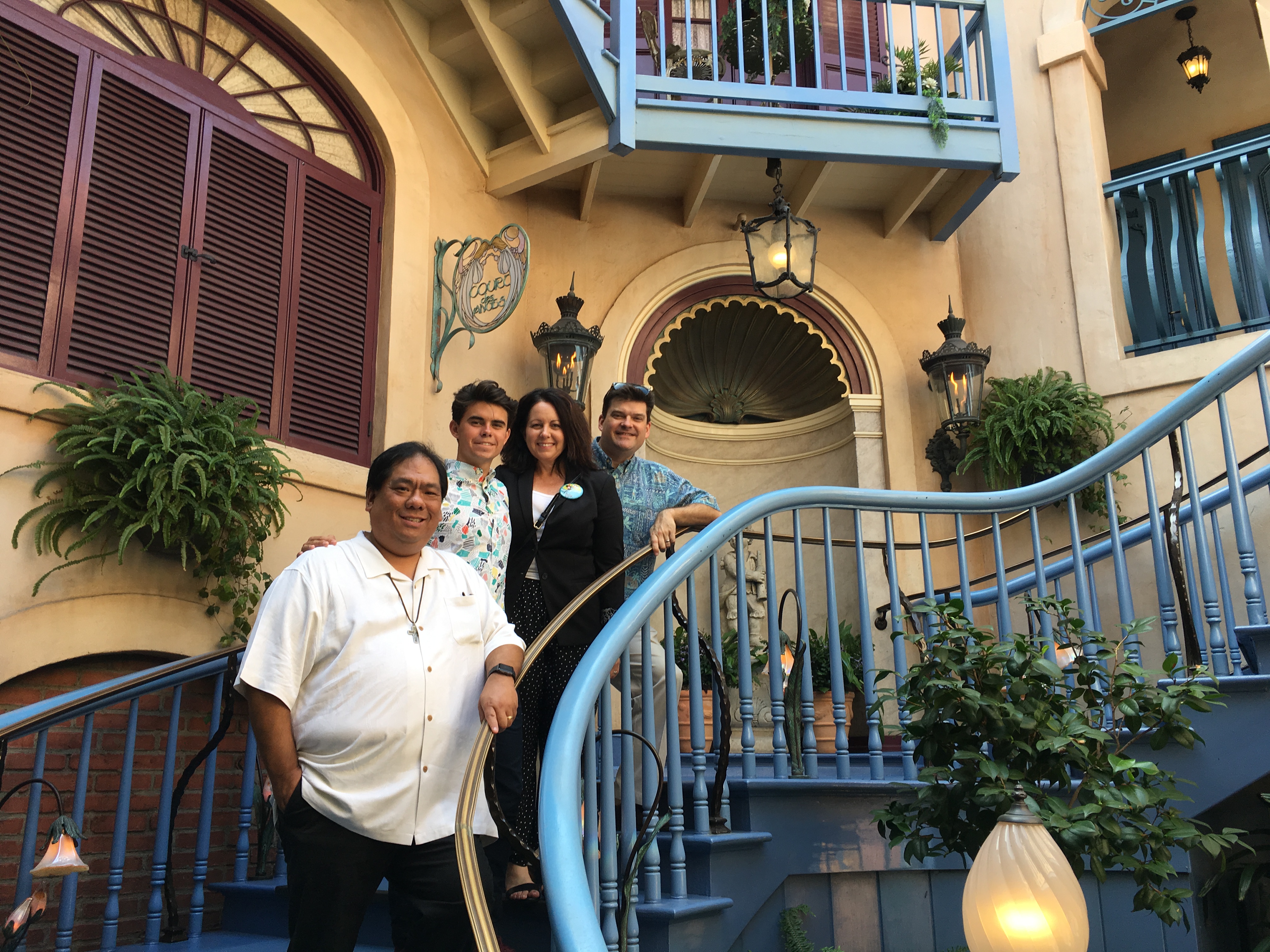 That’s how I was able to go each of the times I went.  It was recently revamped in 2014 and I haven’t been back since the refurbishment, so this was a real treat.  It was my friend Andrea’s birthday and her husband John asked if I’d like to come to help her celebrate.  Of course I said, “Yes!”  Not only is Andrea one of my closest and long-time friends, but it’s Club 33! The new entrance is a little bit down the street.  The old door is still there, but the new door leads into a small reception area and an interior courtyard where they served us “lavender water” while we waited to go up.  They have a nice spiral staircase that leads up to the dining area, but there is an elevator for if you’d prefer.  It’s not as kitchy as the old elevator with the sliding gate, but probably rated a lot safer.  Still I like the old one better.