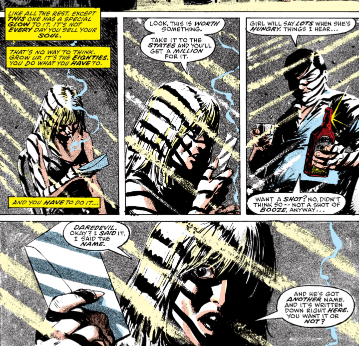 At the end of Season 2 of the Netflix series, Karen finds out that Matt is Daredevil. In the comics, Karen eventually uses that information for a fix. She sinks fast into a life of drugs after she and Matt part ways and she needs a hit, so she decides to sell out her ex-boyfriend. Karen from the Netflix series hasn’t moved in that direction – yet. But will she? Or will this be one of those divergent points? Time will yet tell. In the comics, it took Karen a long time before she turned to drugs and in the end she gave her life for Matt.