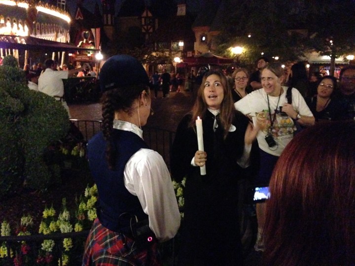 And what Halloween tradition would be complete without trick-or-treating? We received a caramel marshmallow treat covered in orange sugar at Candy Palace that is only available on the Happiest Haunts Tour. We were also treated to iced pumpkin spice cookies decorated to look like, what else, pumpkins! And outside of Starbucks at the Market House we had our choice of a shot glass sized salted caramel iced chocolate drink or pumpkin spiced latte. Personally, not my thing, but most people loved it. If that weren’t enough, at the very end everyone received a special collectible pin featuring the Haunted Mansion. If you’re a pin collector, these are special treats since you can’t buy them anywhere.