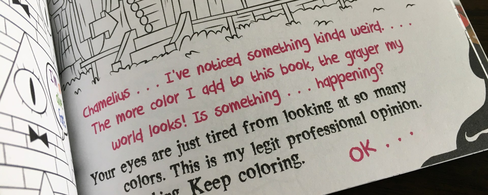 It’s too late anyway. You’re cursed. Leave it to Alex Hirsch, the creator of Gravity Falls to come up with yet another innovative way to continue the story of the Pines twins in this cute, intriguing, and new approach to the COLORING book. But it’s not quite a coloring book now is it? No. Instead it’s another adventure in the life of Dipper and Mabel. Dipper gets caught in the pages of a coloring book and the only way out is for you and Mabel to help color him out…or not!