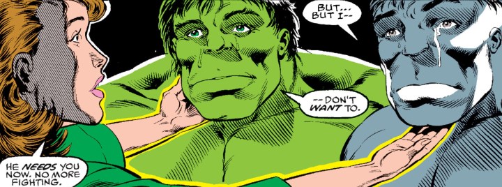 Incredible Hulk #377: Peter David is one of the most renowned Hulk writers and his work with artist Dale Keown has to be one of the landmark runs on the book. It was revealed in this issue that Bruce Banner suffers from multiple personality disorder and the green and gray Hulk are different personalities Bruce manifested after his exposure to the radiation. By the end of the issue, Doc Samson (Bruce’s friend and another of the gamma-irradiated family) is able to integrate all three into one. What we get is a fully integrated Hulk with the brain of Bruce Banner.