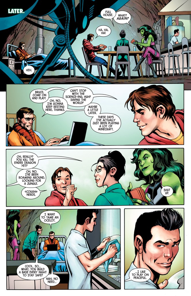 Totally Awesome Hulk #8: After the conclusion of Secret Wars (the reboot), we are introduced to a completely new Hulk – Amadeus Cho. Not only has someone else assumed the mantle of the Hulk, but Bruce Banner is actually cured! What makes this issue so special is it shows Bruce completely at peace. He’s recovering from the flu (which he hasn’t had to deal with since becoming the Hulk) and playing Minecraft while surrounded by his friends. It seems FINALLY Bruce has found the peace he has always craved.