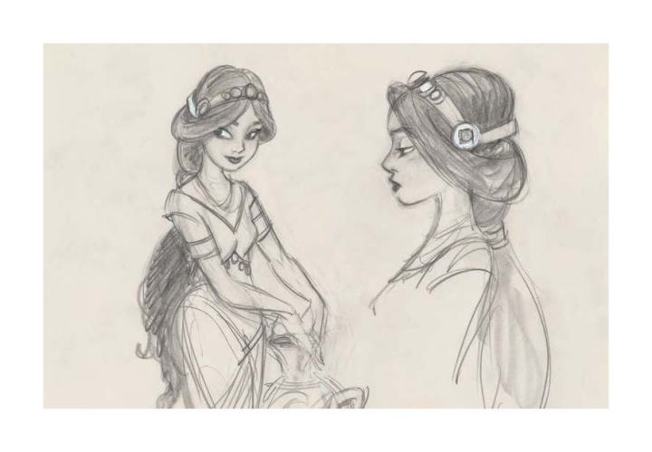 What I loved was seeing rare and rarely seen concept art from some of my favorite animated films. Did you know for instance that in early concept art Belle from Beauty and the Beast was blond? And that there was a bathing scene with dancing clothes? An early image of The Evil Queen in Snow White did not project her as a rival for Snow White’s beauty it did in the film. Concept art of Aladdin showed him with a mustache and Pocahontas had much darker brown skin. Mary Blair even did a piece for Cinderella showing her in a very cartoon like format. To compare the early production art to the finished product is fun to see.