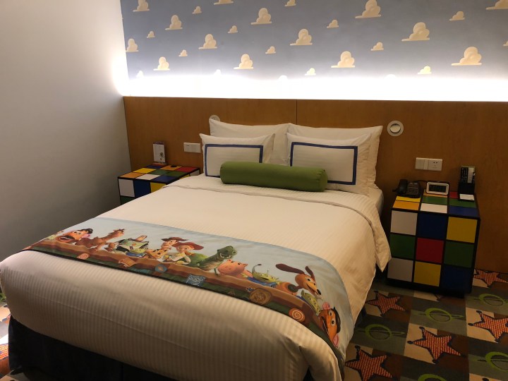 Overall Room Impression: I have a feeling we got lucky, but our room was exceptionally large. Much larger than most standard rooms we book in our travels. The rugs are nice and soft (important for me with my flat feet), the room temperature was easy to control (runs a bit on the cold side), we had a big chair with a reading lamp that turns into a second bed, and there is a small table with two chairs big enough to eat a snack on (but not enough to act as a desk). The TV was nice and new (guessing about 40”) and there was an in-room refrigerator. There was plenty of drawer space, an open closet with hangers that are easily removed, and an in-room safe. The Toy Story theme was well done. Everything from the rugs to the shower curtain were decorated either with Toy Story characters or had themes and colors reflective of the films.