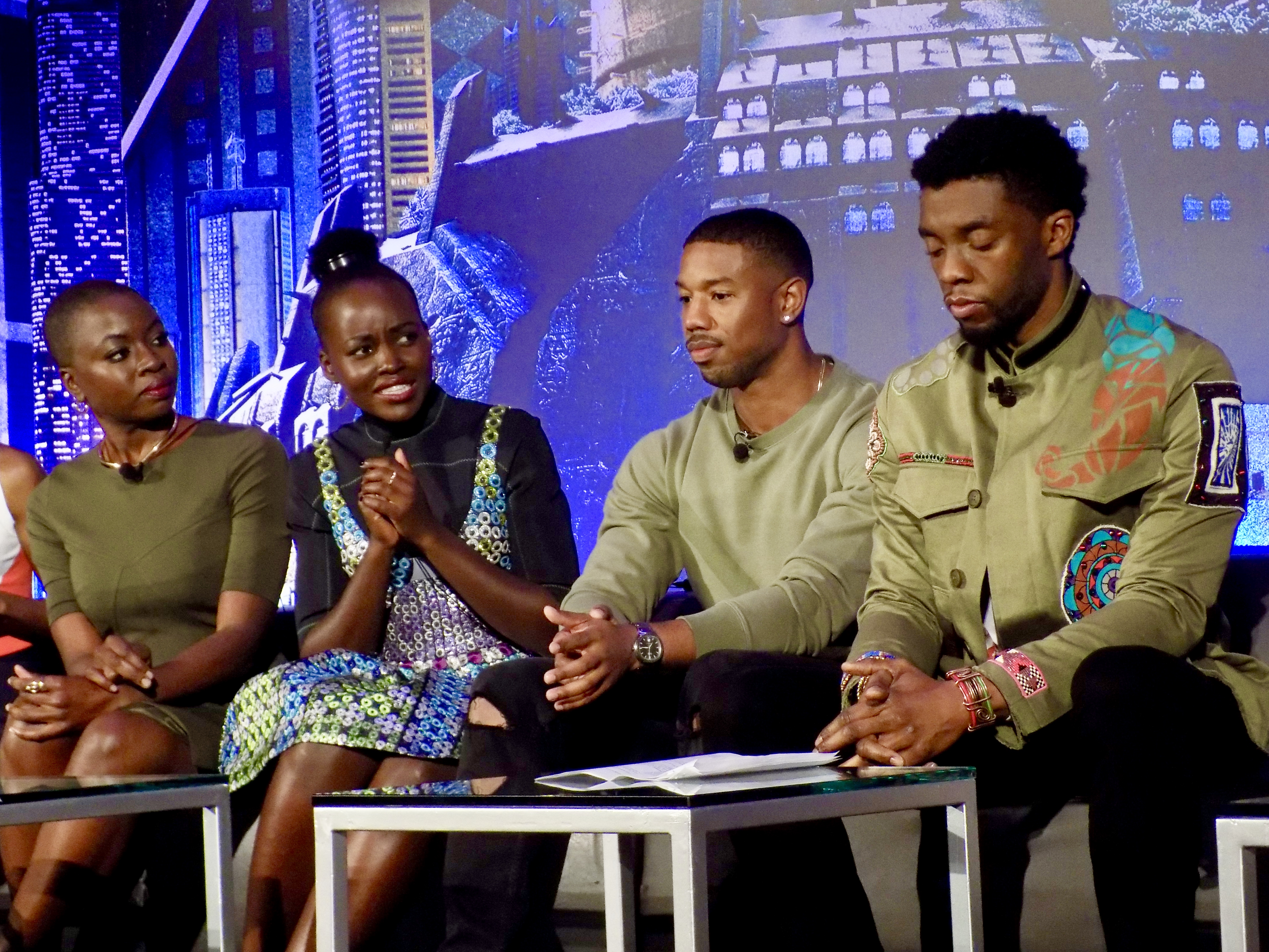 Not surprising when you listen to the cast and filmmakers talk about their insights into this project. They are not only talented at their craft, but they are all intelligent and articulate and passionate about this film and these characters. Take for example Chadwick Boseman who played T’Challa (Black Panther). When asked if Shuri (Black Panther’s sister) was smarter than T’Challa, Chadwick teased, “I allow it.” But then clarified what he meant. He said, “So you know, my older siblings, they raised me. And so to a certain degree when I say, you know, ‘I allow her’ – I’m mean it like, you see the genius that is inside the people that come after you. And if you have an ancestor around, they’re looking at you like, ‘I know you’re looking up to me, but we’re looking up to you.’ That is an African concept.” Just the way he shared that story gave me goosebumps. Thinking about this ancestral connection to one another and this concept of loving one another so much that you nurture other people’s talents even if it means sacrificing your own for the greater good. Wow.