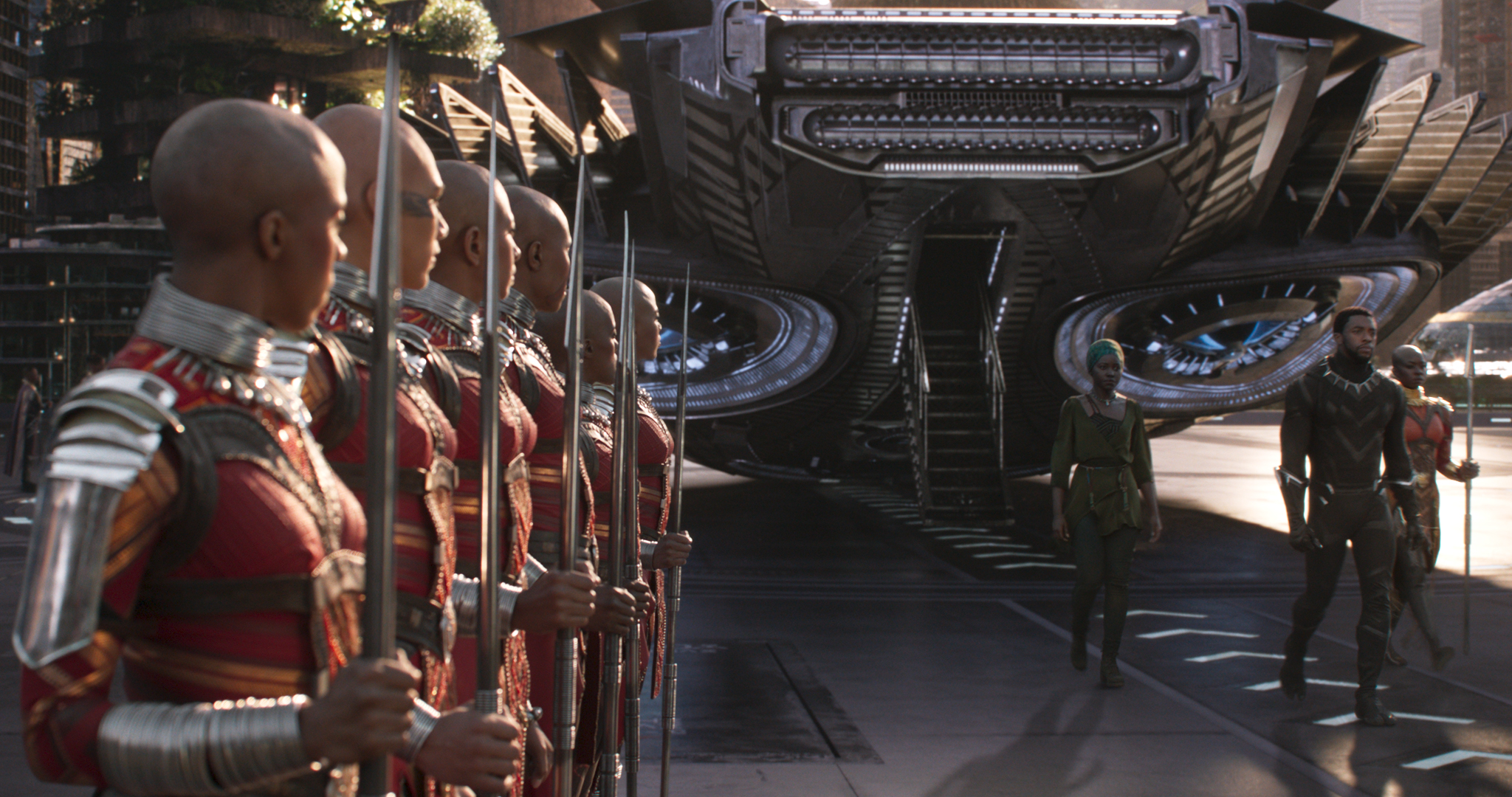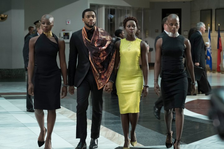Black Panther/T’Challa (Chadwick Boseman) with Nakia (Lupita Nyong’o) and Okoye (Danai Gurira)