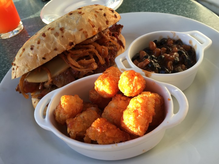 The first time I went, I ordered the Beef Brisket Sandwich. Normally I go the gluten-free route, but it was worth it this once to experience my favorite style of beef with crispy onion strings and tater tots (which surprisingly are not gluten-free – perhaps because they are cooked in a non-gluten-free fryer?). The taste and flavor was great. The meat was not dry, but cooked just right. The tots were crispy yet soft inside like they should be. And the slaw was not too much vinegar or sugar but with the right balance. I loved the baked beans. They weren’t done like sugar beans, but had a nice rich flavor and some depth to it as well.
