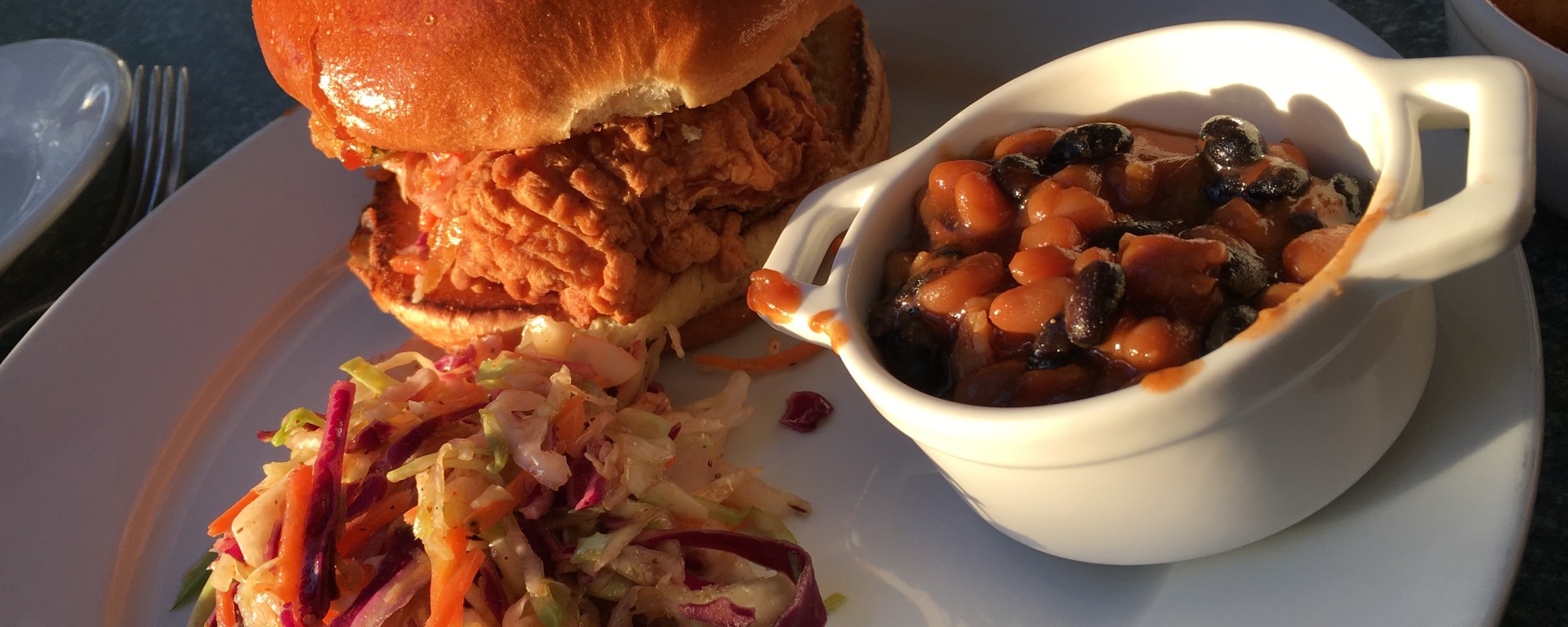 The first time I went, I ordered the Beef Brisket Sandwich. Normally I go the gluten-free route, but it was worth it this once to experience my favorite style of beef with crispy onion strings and tater tots (which surprisingly are not gluten-free – perhaps because they are cooked in a non-gluten-free fryer?). The taste and flavor was great. The meat was not dry, but cooked just right. The tots were crispy yet soft inside like they should be. And the slaw was not too much vinegar or sugar but with the right balance. I loved the baked beans. They weren’t done like sugar beans, but had a nice rich flavor and some depth to it as well.