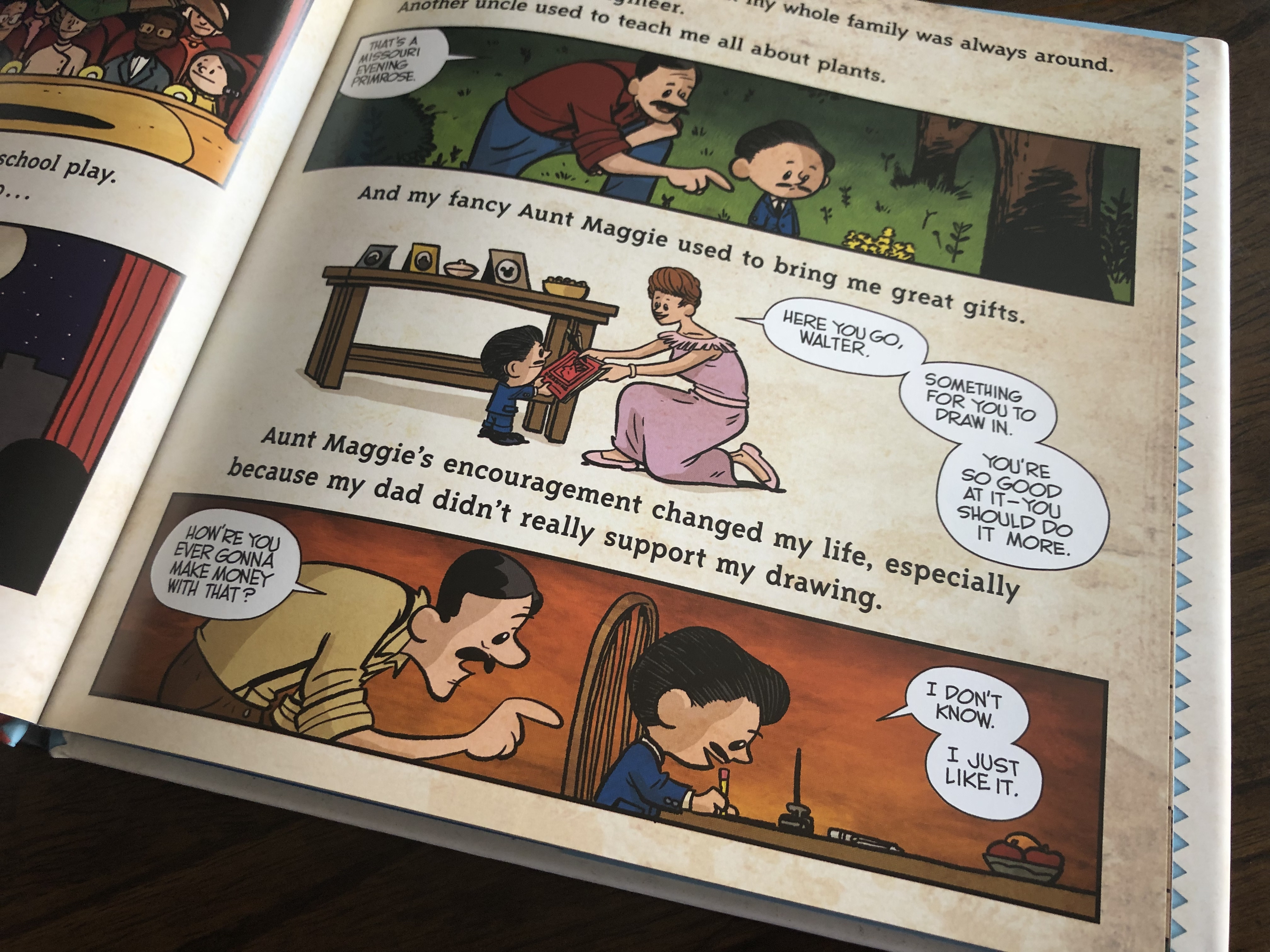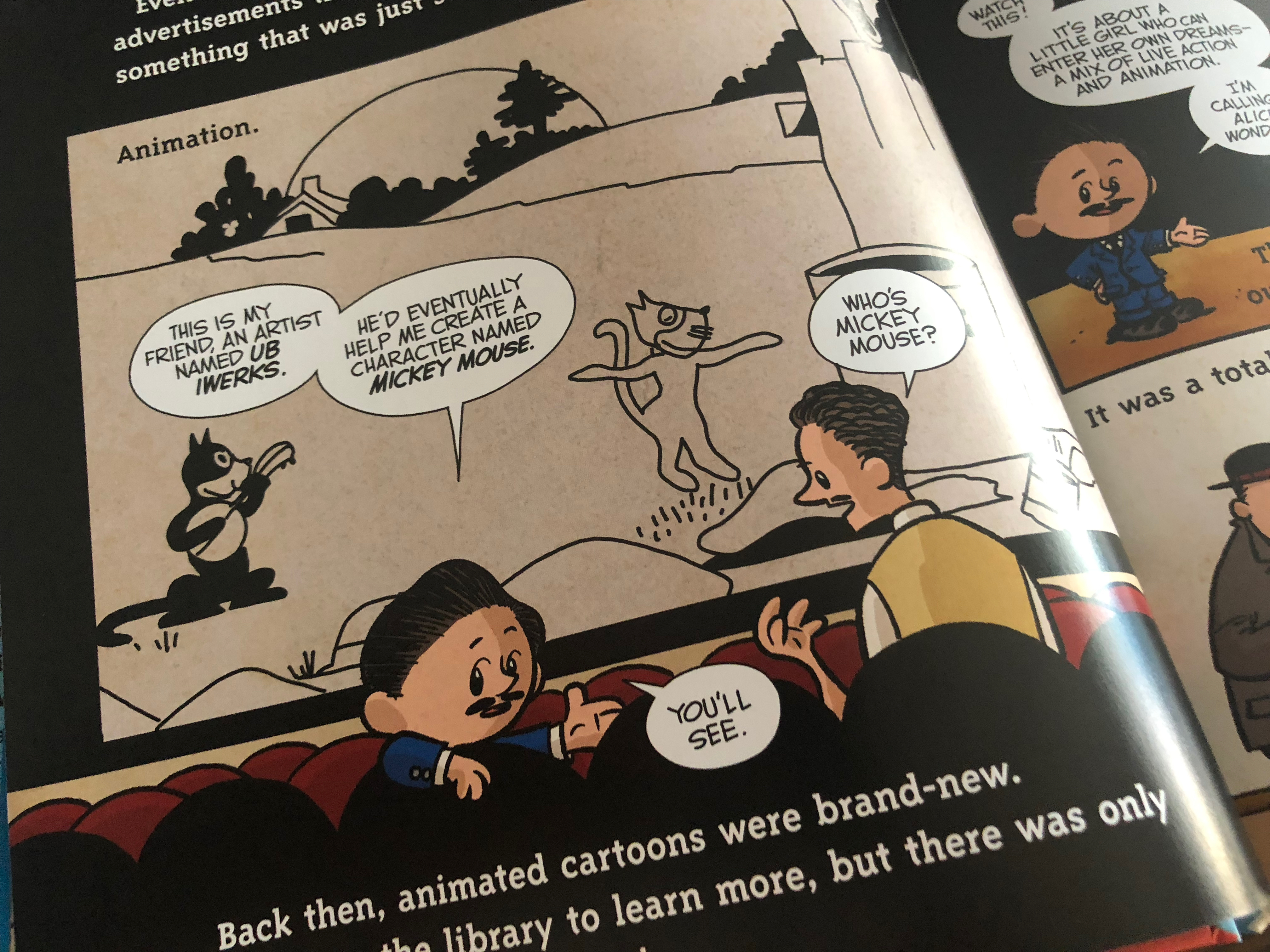 The book is wonderfully written and illustrated and it’s hard not to love Walt taking to his dad with both of them sporting mustaches! But the book doesn’t paint Walt as some larger than life figure. It shows the times he failed and more importantly how he persevered. It shows Walt making mistakes (like painting the side of his house with tar!). And it shows how he didn’t do it alone. It gives more credit to Ub Iwerks than he is often given and rightfully credits his wife Lillian with coming up with Mickey’s name. It shows people in his life I hadn’t heard before like his Aunt Maggie who inspired and encouraged Walt to pursue his artistic talents.