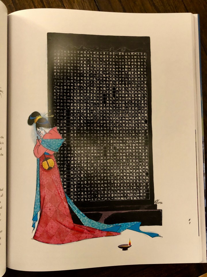 Included in the book, along with all of the stories and beautiful art, is the original “Legend of Mulan.” A short poem but one rich in visual imagery, it is clear how this was the heart of the film. It was interesting to read about the legend of Mulan and how in many ways she is a lot like King Arthur – blurring the line between reality and myth. Was she real or simply a story? Many claim she existed, but what isn’t clear is when, where, or who she was. There are three different claims on her family name alone. Some know her as “Zhu;” others as “Wei;” and perhaps most commonly she is known as “Hua” or “Fa Mulan.” But the discrepancies don’t discount her existence. Rather they go to enforce how beloved she is by so many. Everyone wants to claim Mulan for themselves.