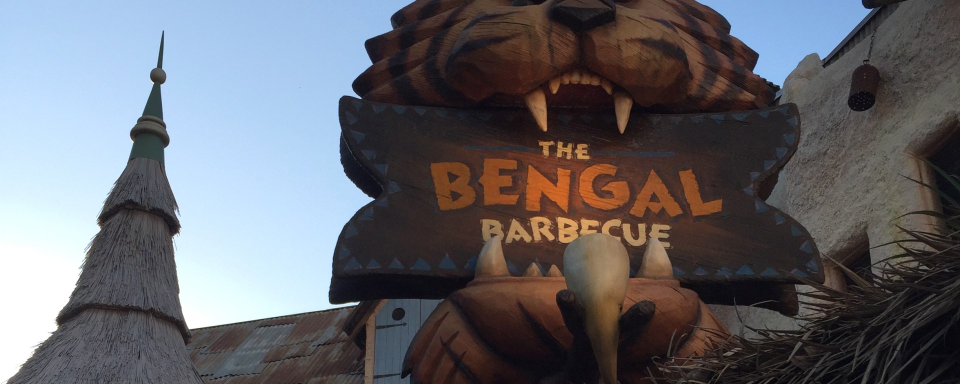 FOOD: Pretty much you are here for the skewers. While there are some other options, there aren’t many. But then isn’t it best when you know they concentrate on doing on thing well? And The Bengal Barbecue does skewers well! When it opened back in 1990 (I was there!) they were an instant hit and today they still are, but unlike other food places, this one never seems to have that bad of a wait and you don’t need a reservation. Today they feature six different skewers – the Chieftain Chicken Skewer in a tangy but sweet Polynesian sauce; the Bengal Beef Skewer which they say is marinated in a Zulu sauce but it’s very much akin to a tangy and sweet barbecue sauce; the Banyan Beef Skewer, a pretty spicy option but full of power and flavor; Outback Vegetable Skewer; and the Safari Skewer which is bacon-wrapped asparagus. Recently, they’ve added a bonus skewer – the BBQ Pork Belly Skewer! They’ve described it as “grilled pork belly served on a ‘boat’ of iceberg lettuce, topped with Hoisin sauce, pickled carrots, daikon, and cilantro.” All I can tell you is that it is darn good! My favorite of them all. They do have specialty drinks from time-to-time. My favorite is the Jungle Julep – a mix of pineapple, orange, lemon, and grape all in one. YUM! If they have it be sure to order it! Kind of like an Icee / slushee.