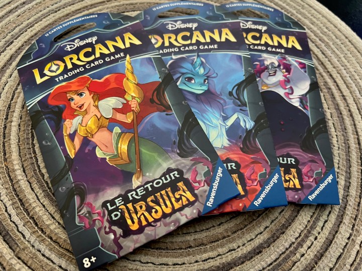 One of the terrific things about Lorcana is you never need the prize collectible Enchanted level cards to play the game or any of the promos. All of these special cards (soon to include Epic and Iconic level cards) are fancy reproductions of existing cards with new artwork and some very fancy bling. Sure some of the Legendary cards are hard to find, but Ravensburger makes it much more about gameplay and skill than about how much money you have to sink to build a competitive deck. Like most TCGs, Lorcana has different levels of rarity for their cards. In an average pack, you’ll find 6 common, 3 uncommon, 1 foil (of any rarity), and TWO rare/super rare/legendary cards. Most TCGs give you one rare or higher per pack, but Lorcana gives you two (and sometimes THREE) in every pack. It’s still tough to get a playset (four of the same card) for some of the most collectible cards out there, but it’s much easier than many other games.