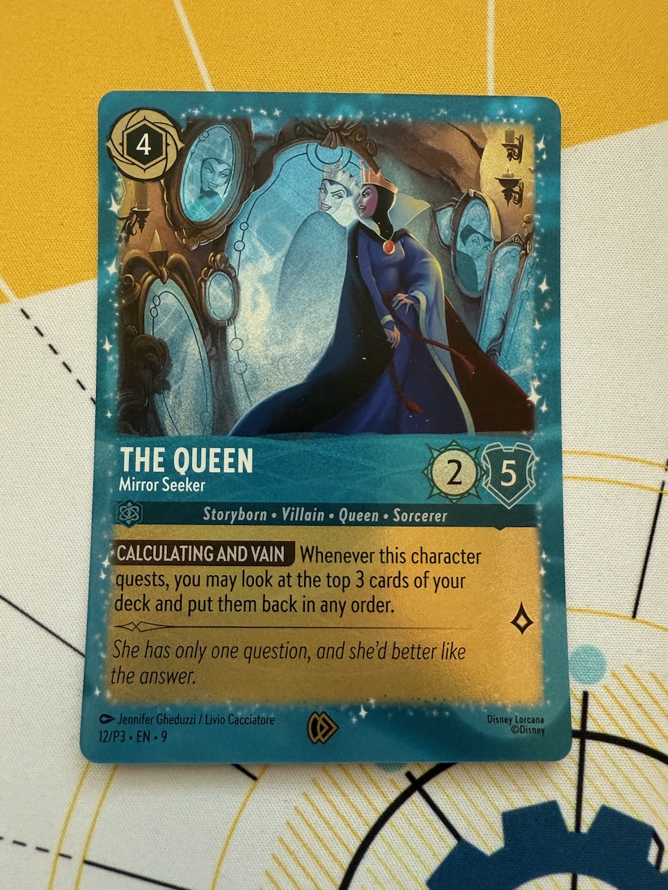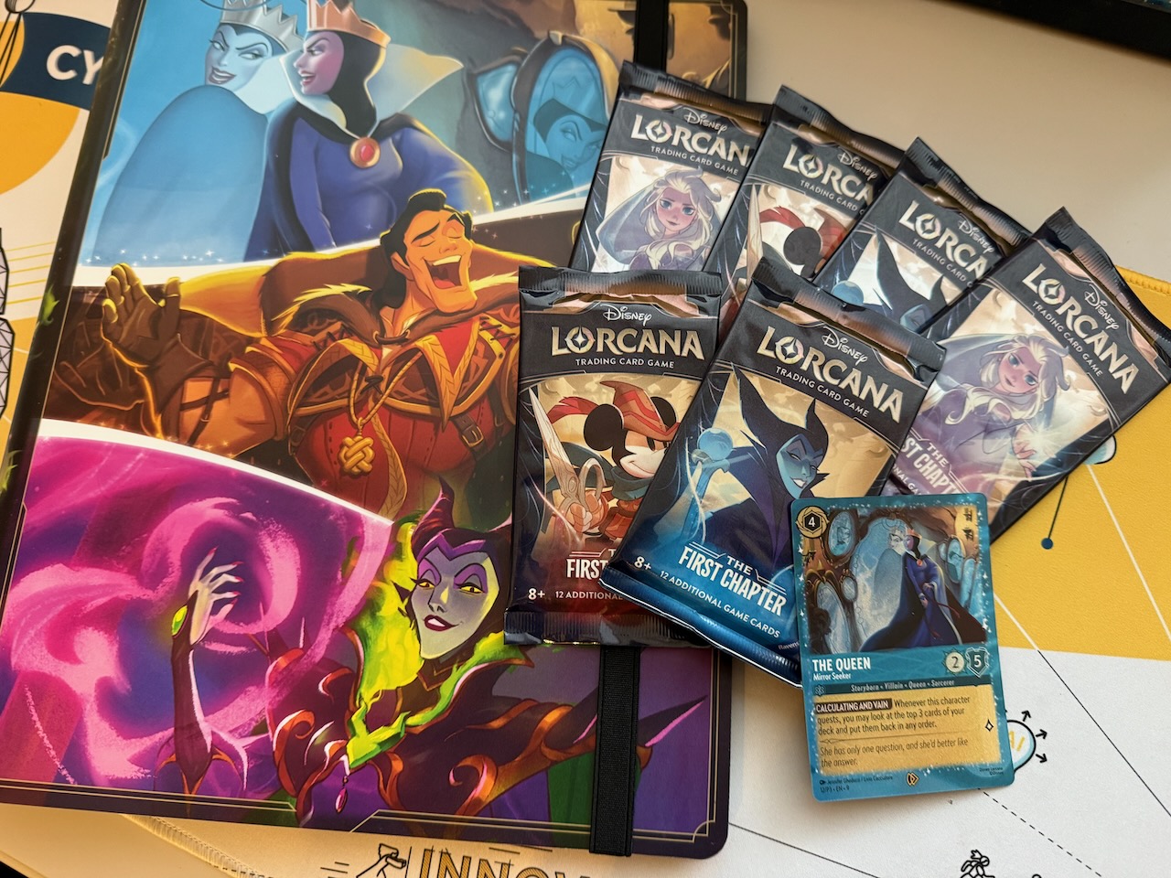 In the bundle comes a villains themed portfolio, 6 packs of The First Chapter boosters, and a special edition promo card of The Queen, Mirror Seeker. The portfolio is a full-sized one that can hold your entire Whispers in the Well collection (the set has 251 cards and the portfolio holds 252). The original artwork is beautiful as is all the artwork Ravensburger does. You might think getting The First Chapter boosters is no big deal since it’s been out for so long, but many of those cards are still legal in the new core collection thanks to the Fabled set that recently came out. Plus, it’s always fun looking for those Enchanted cards. The promo card carries the special border so many of the recent promos carry. It’s still the same artwork, but has a full color border that matches the color of the card.